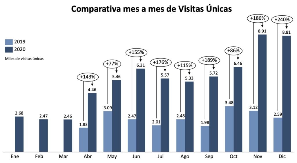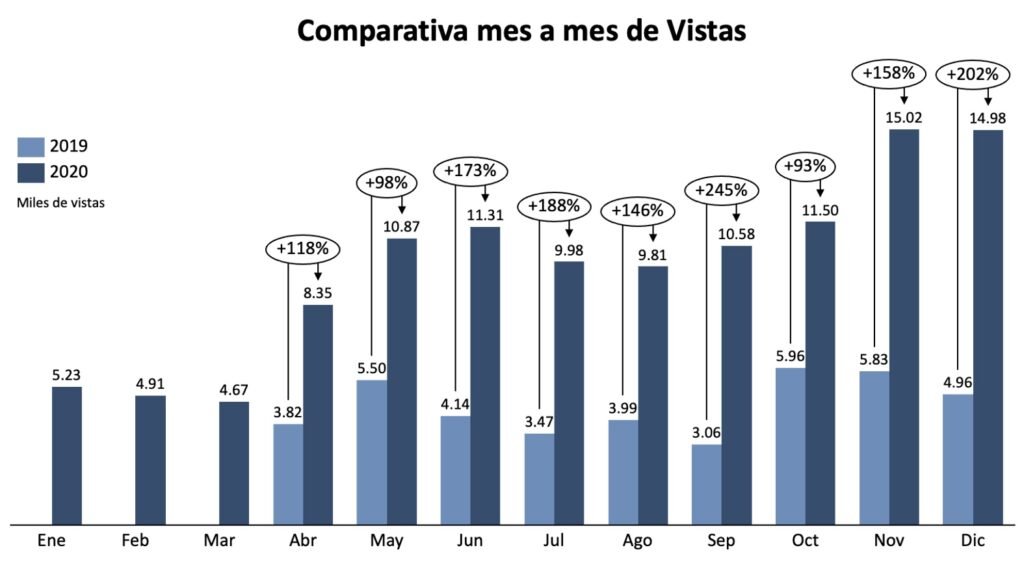 Para hacer comparativas entre el 2019 y 2020, me metí al detalle del crecimiento del mes comparado al del año pasado. Como mencioné arriba, tuvimos un crecimiento importantísimo en tanto vistas como visitantes únicos que podrán apreciar en las gráficas de abajo. Las vistas, mes a mes, estuvimos con un crecimiento casi del 100% en todos los meses, con un par de meses rebasando el 200% de crecimiento.