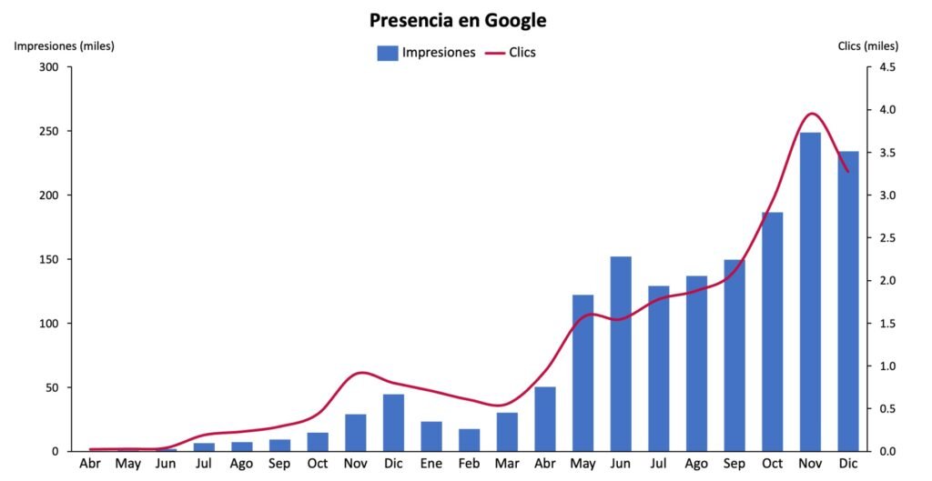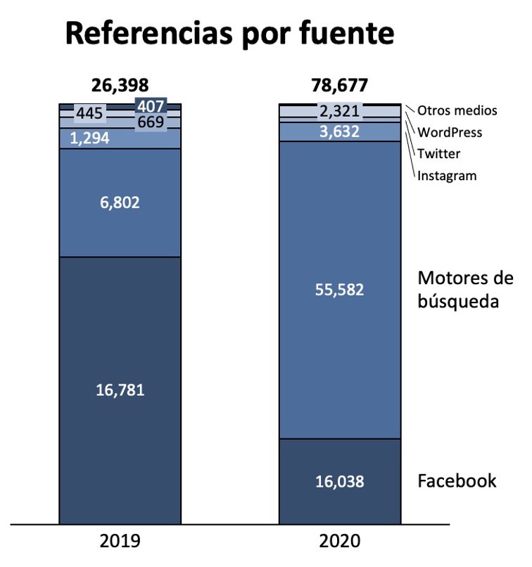 Como vemos con estos datos y la gráfica de abajo, no hubo mucho crecimiento en este frente. Debería de prestar más atención, ya que fue lo que impulsó el crecimiento en el 2019. Lo que impulsó el crecimiento este año fue las apariciones y clics en Google, como vemos en la gráfica de arriba de Presencia en Google y la de abajo. La categoría de Motores de Búsqueda, liderada por Google, creció más de un 700%.
