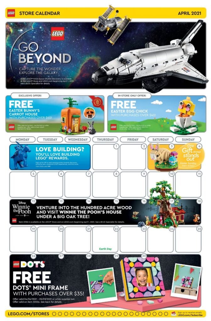 Ya está disponible el calendario de abril 2021 de las LEGO Stores. Estos calendarios muestran las promociones y eventos del mes. Recuerda que este es el calendario de las tiendas de Estados Unidos. Aquí en México no existen estos calendarios como tal. Uso estos calendarios para darnos una idea de las promociones que nos esperan cada mes.