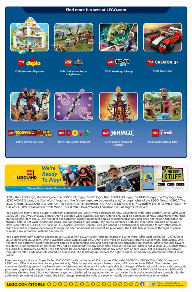 Otra vez, gracias al COVID, el calendario está bastante vacío en cuanto eventos. Lo que quiso resaltar LEGO en el calendario del mes de agosto fue el gran lanzamiento de su tema nuevo de LEGO Super Mario, incluyendo el LEGO NES (71374).