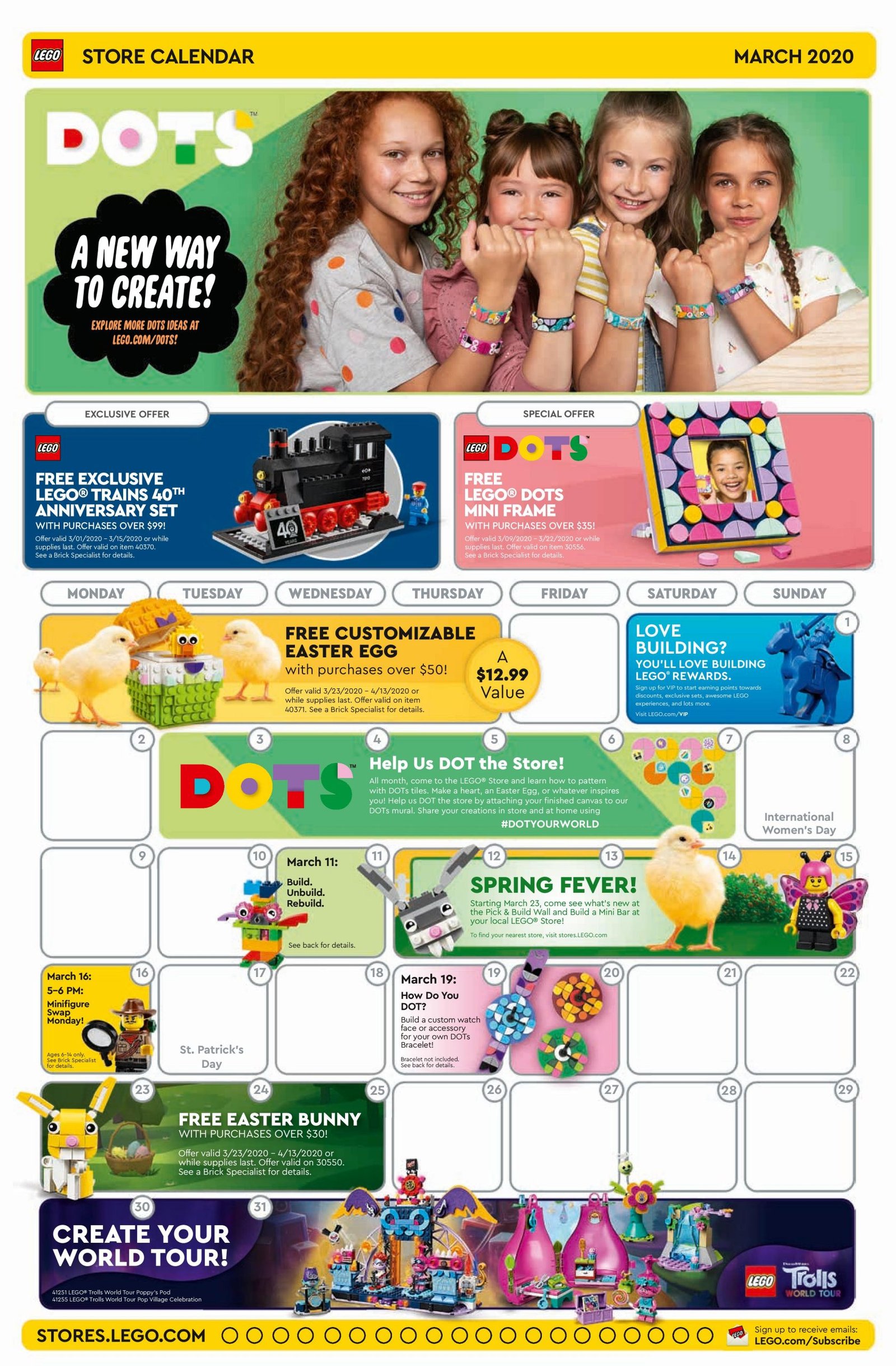 Del 1 al 31 de marzo: Ayúdanos a DOT la LEGO Store. Diseña un patrón 6×6 para un canvas gigante con las piezas que te den. Dado que LEGO Dots no lanzará en México, no creo que pase este evento aquí.