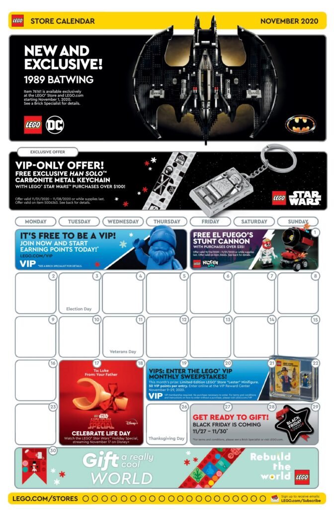 Ya está disponible el calendario de noviembre 2020 de las LEGO Stores. Estos calendarios muestran las promociones y eventos del mes. Recuerda que este es el calendario de Estados Unidos porque en México no existen calendarios como tal. Uso estos calendarios para darnos una idea de las promociones que nos esperan cada mes. Para noviembre, tendremos promociones de LEGO Star Wars, y más sorpresas para Black Friday.