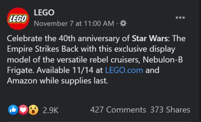 LEGO ha confirmado vía Facebook el cuándo y el dónde se venderá su set exclusivo del San Diego Comic Con 2020. El LEGO Star Wars Nebulon-B Frigate (77904) estará disponible para su compra directamente de la página web de LEGO y vía Amazon a partir del 14 de noviembre, hasta agotar existencias. Recuerda que solamente estará disponible en Estados Unidos, por lo cual necesitarás una dirección americana para poder comprarlo.