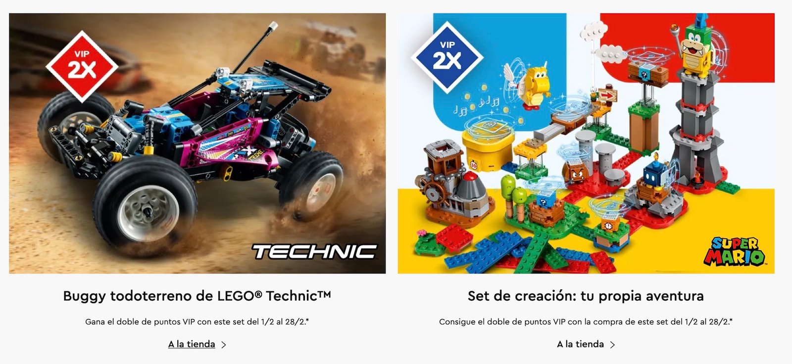 Hay algunos sets nuevos que han estado rotando en cuanto lo que otorgan de puntos LEGO VIP este inicio de año. Para febrero, le toca al LEGO Technic Buggy Todoterreno (42124) que en su compra te otorgará 2,030 puntos. El otro set de promoción es el LEGO Super Mario Set de Creación: Tu propia aventura (71380) que en su compra te otorgará 1,050 puntos. La promoción será válida hasta el 28 de febrero.