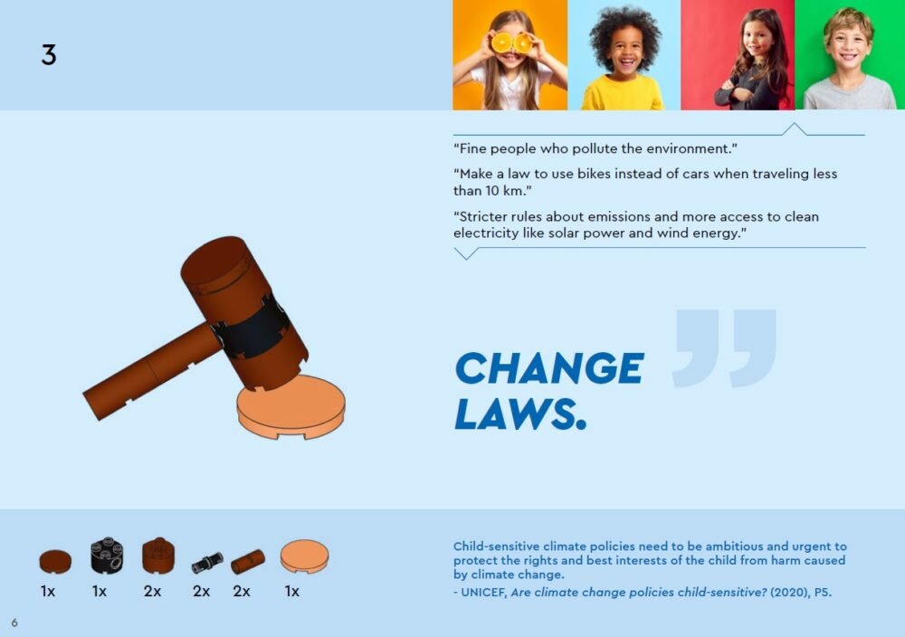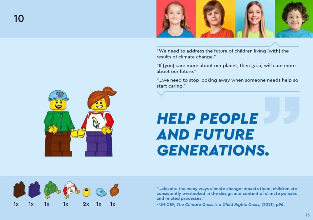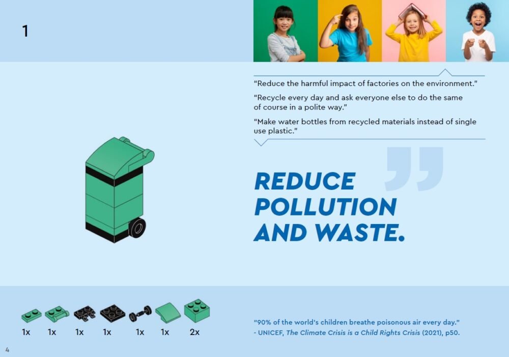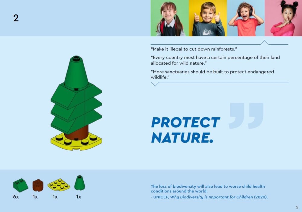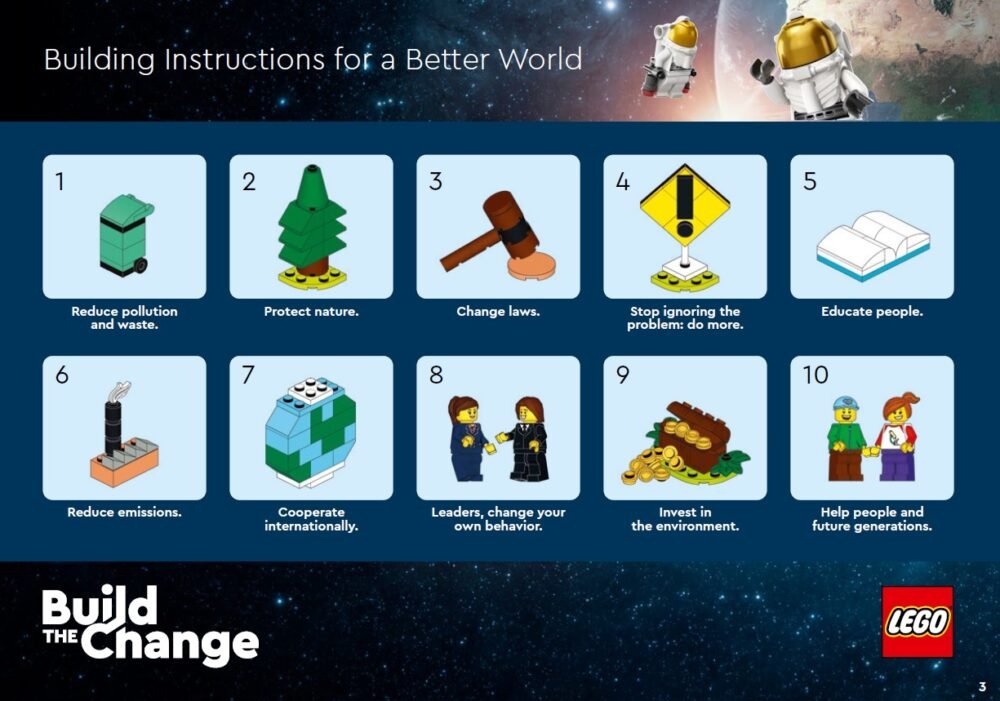 En la conferencia de las Naciones Unidas Cambio Climático 2021 (COP26), la juventud exige acción ante este reto. LEGO pidió a los líderes del mundo considerar los puntos de vista de los niños. En resumen, LEGO creó Building Instructions for a Better World (031102021) para que los políticos actúen tomando en cuenta estas “instrucciones”. Estas instrucciones vienen directamente de la mente de niños y niñas y su opinión acerca de cómo combatir el cambio climático y construir un futuro sustentable.