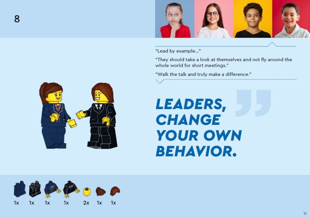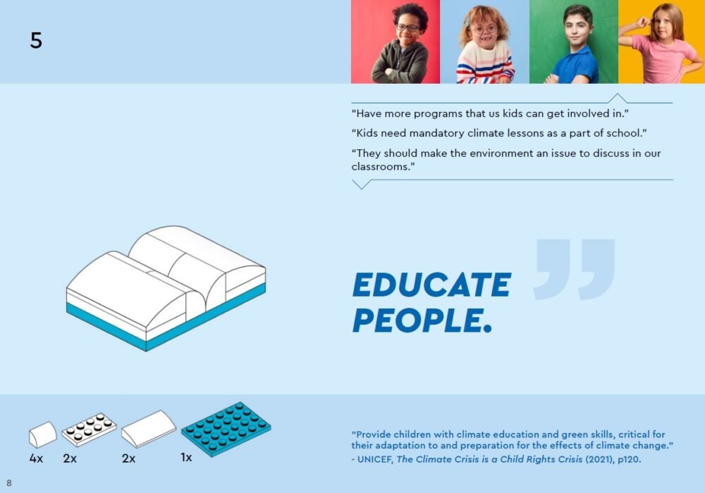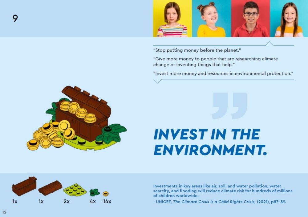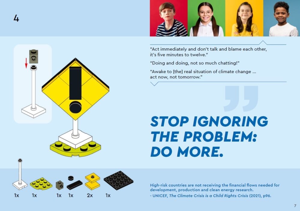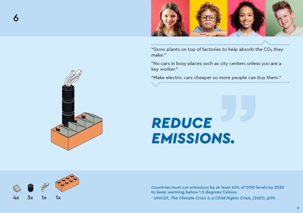 En la conferencia de las Naciones Unidas Cambio Climático 2021 (COP26), la juventud exige acción ante este reto. LEGO pidió a los líderes del mundo considerar los puntos de vista de los niños. En resumen, LEGO creó Building Instructions for a Better World (031102021) para que los políticos actúen tomando en cuenta estas “instrucciones”. Estas instrucciones vienen directamente de la mente de niños y niñas y su opinión acerca de cómo combatir el cambio climático y construir un futuro sustentable.