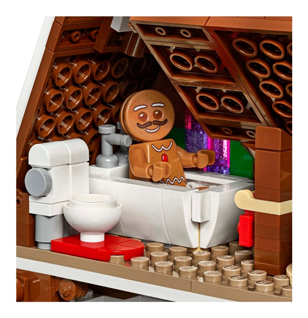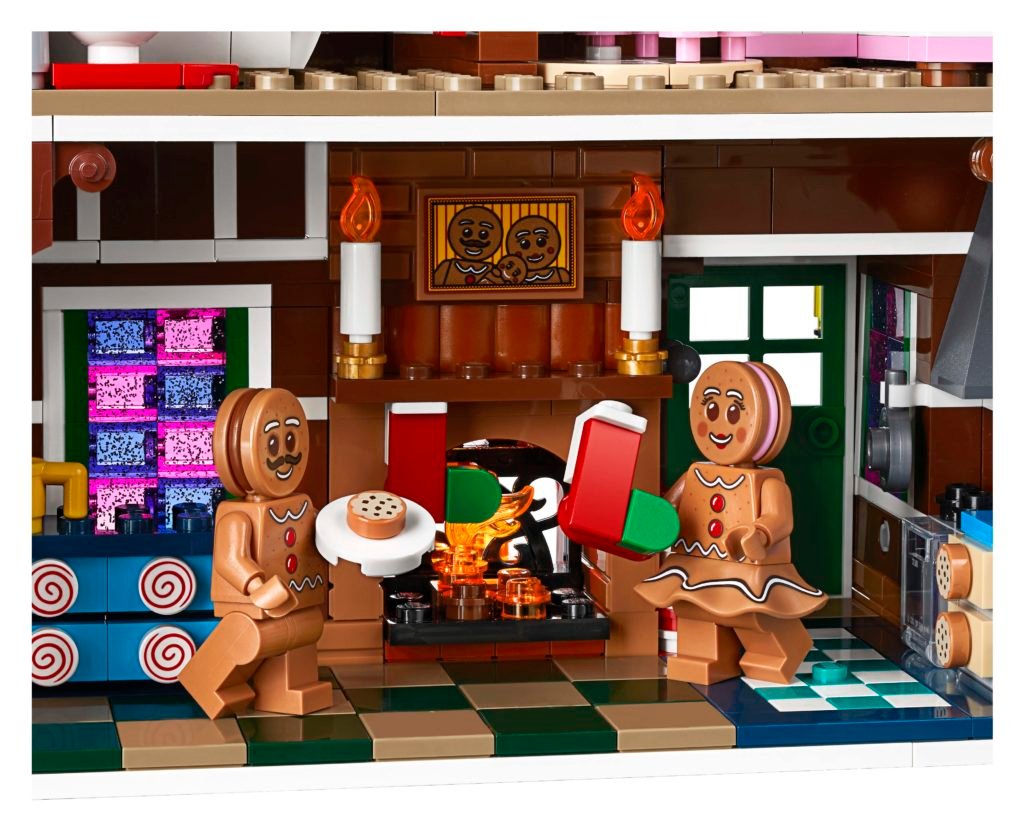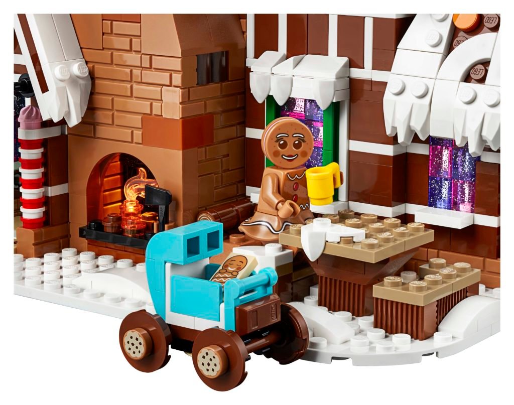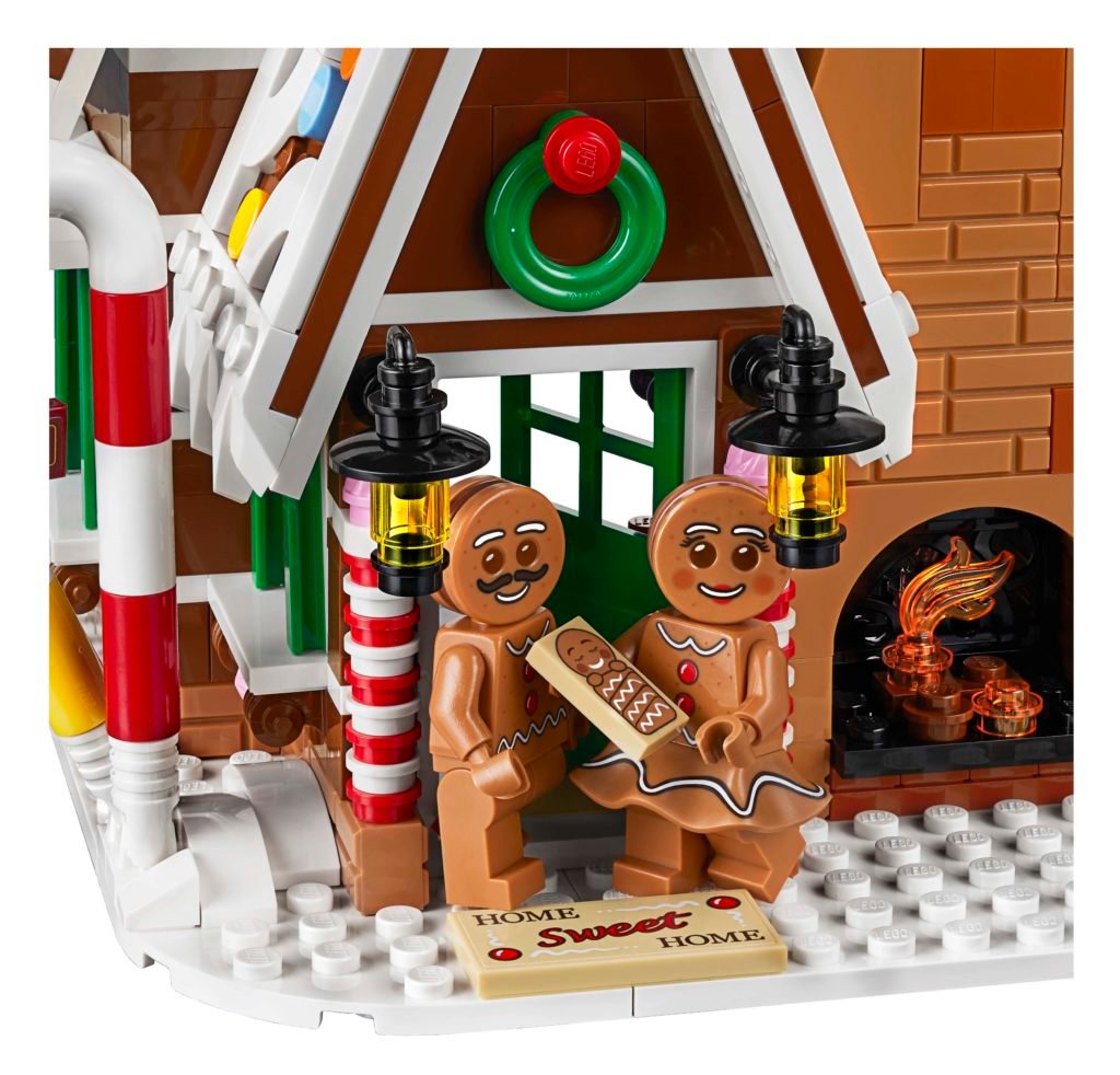 - La Casa de Pan de Jengibre cuenta con tejados escarchados con vistosos botones de caramelo, una rica fachada con bastones de caramelo a modo de columnas y pilares de caramelo, ventanas brillantes y una gran chimenea con hogar que se ilumina; contiene un detallado interior y accesorios como una sopladora de nieve y un carrito de bebé para construir.