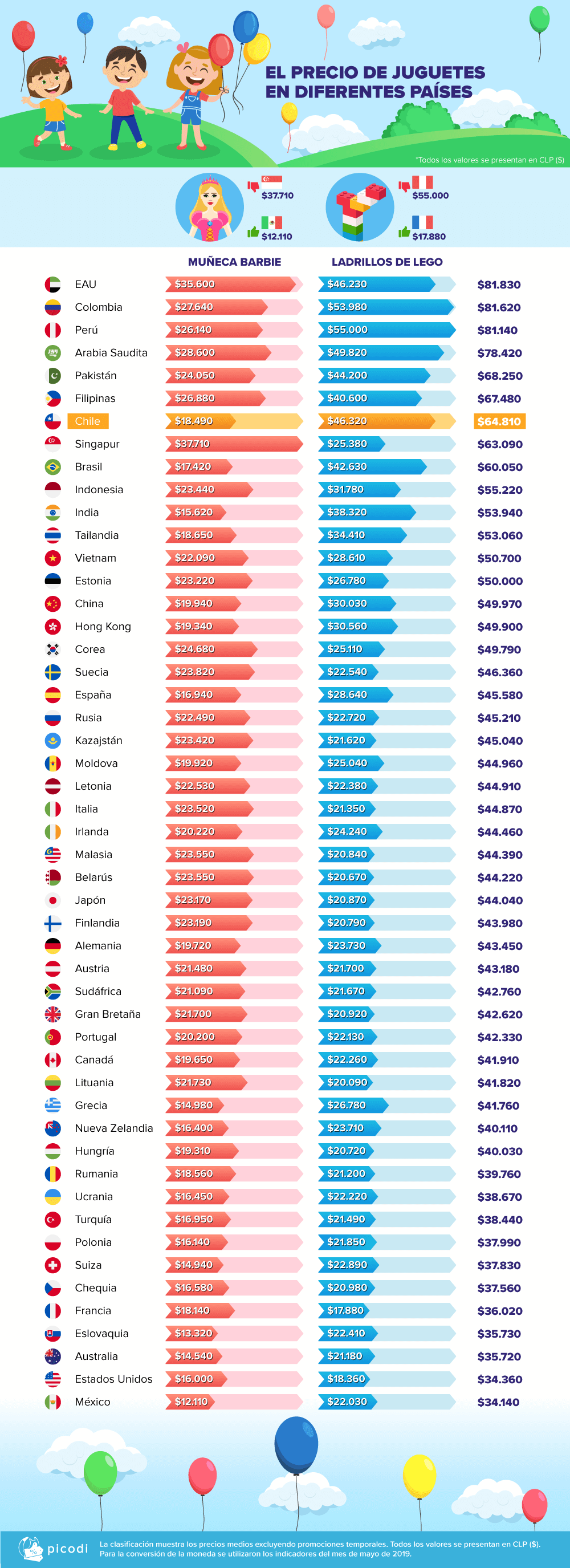 En un estudio conducido por Picodi, se analizó el precio promedio del LEGO Classic Caja Mediana (10696) en cientos de tiendas en 50 países, incluyendo cinco paises Latinoamericanos.