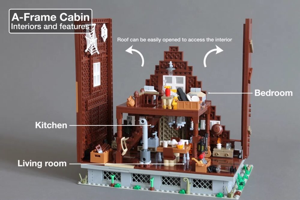 El proyecto de A-Frame Cabin por Norton74 es el más reciente en conseguir los 10,000 seguidores en LEGO Ideas. La construcción se basa en el popular estilo arquitectónico moderno de cabañas. Se abre el techo para mostrar los interiores. Dentro de la cabaña, está muy bien detallada la cocina, estancia y una recámara en el piso de arriba.