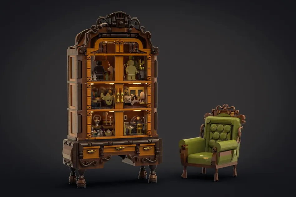 El proyecto de Antique Cabinet por el diseñador terauma es el último en alcanzar los 10,000 seguidores en LEGO Ideas. La construcción de 1,200 piezas presenta un gabinete de madera tallada lleno de antigüedades al azar. También incluye un sillón.