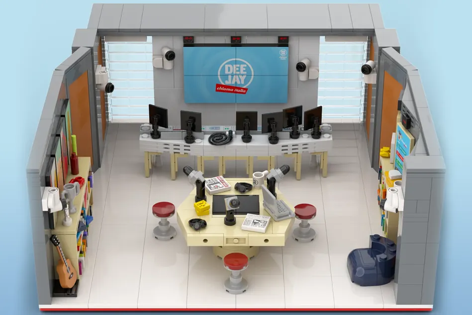 El proyecto de Deejay Chiama Italia por el diseñador FACEBRICKUP es el último en alcanzar los 10,000 seguidores en LEGO Ideas. La construcción recrea la sala de estación de radio donde Deejay Chiama Italia transmite su programa.