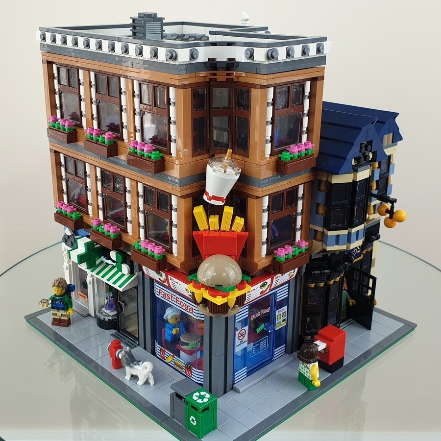 El proyecto de Fast Food Corner por el diseñador RobinHoodBricks es el más reciente en conseguir los 10,000 seguidores en LEGO Ideas. Este proyecto es un edificio con restaurante de comida rápida, casa de empeño, farmacia y tienda de artículos para aventuras al aire libre. Cada establecimiento cuenta con características interesantes, como un muro para escalar. En las imágenes se pueden identificar varias minifiguras, pero el creador no las cuantificó en su descripción.