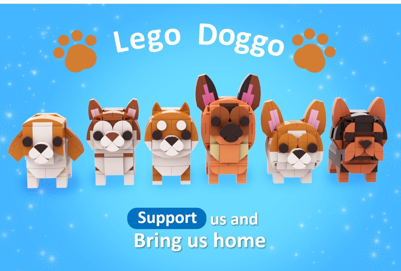 El proyecto de LEGO Doggo por el diseñador legotruman es el más reciente en conseguir los 10,000 seguidores en LEGO Ideas. Este proyecto incluye la construcción de seis diferentes razas de perros, siendo éstos un Beagle, Corgi, Pastor Alemán, Husky, Shiba Inu, Yorkshire Terrier, y Pug. Son de buen tamaño y le combina bien a los LEGO BrickHeadz o hasta a las minifiguras.