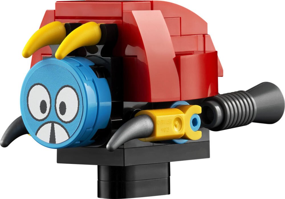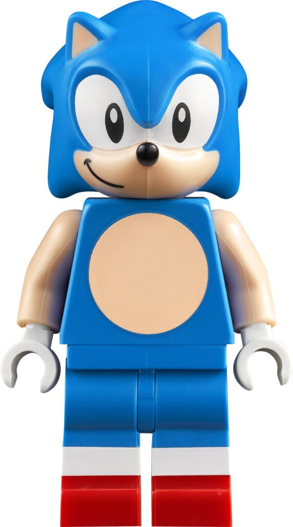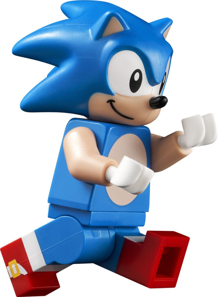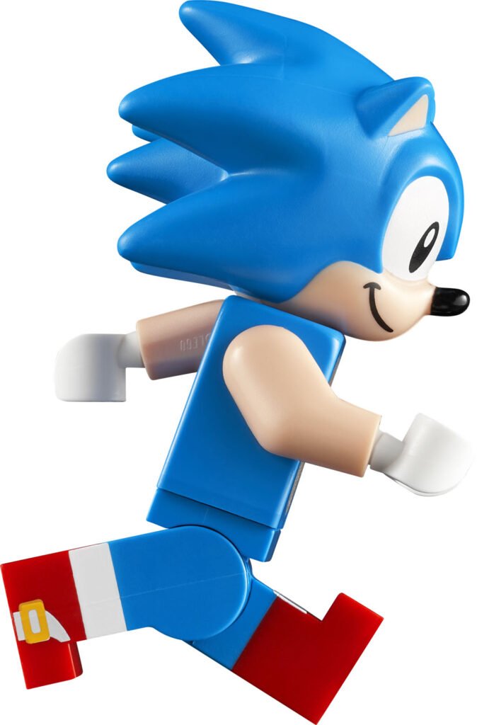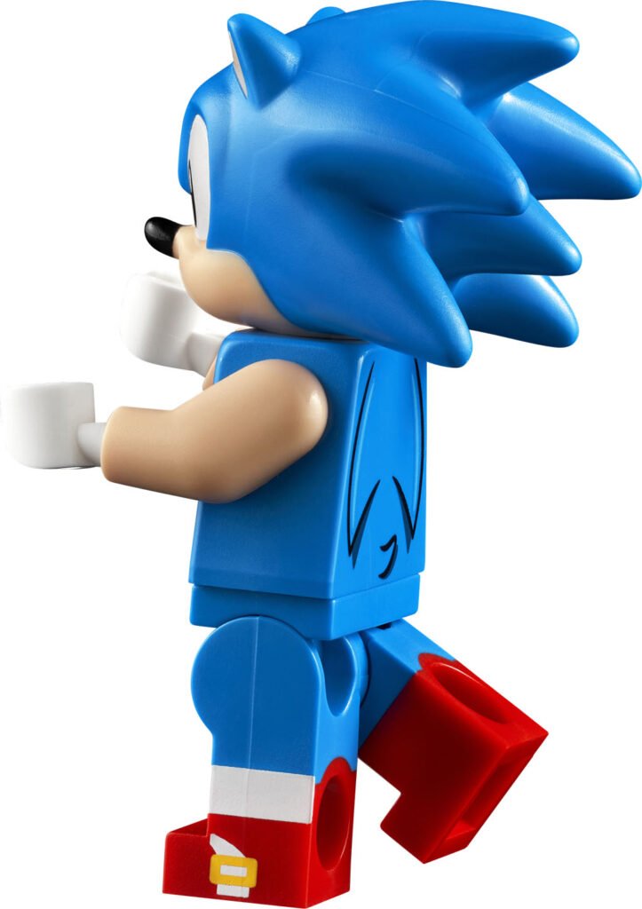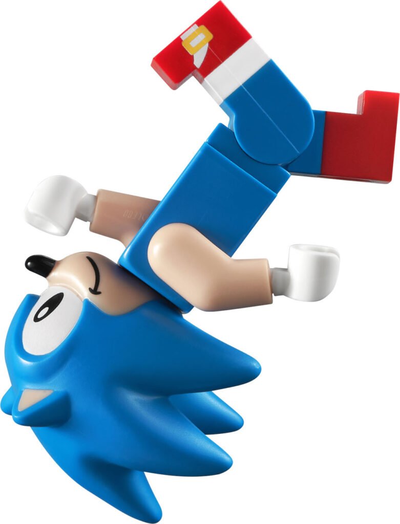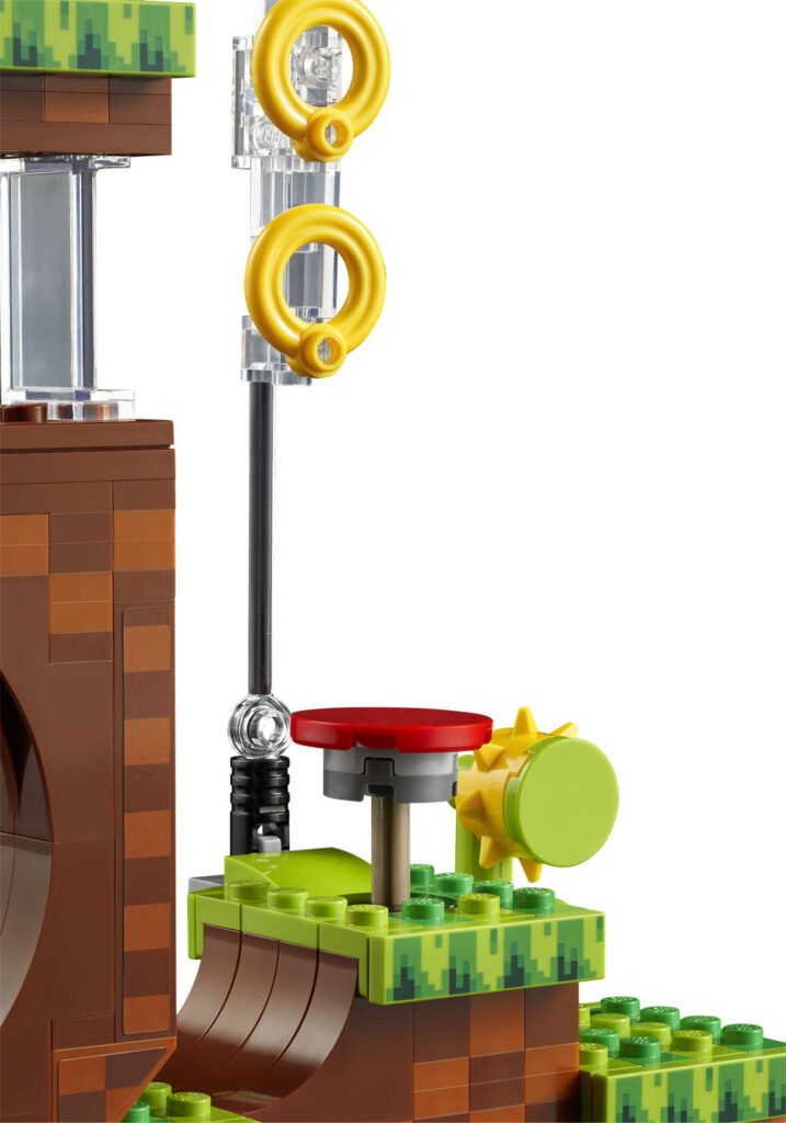 Noten que este set incluye varios pins en los lados, para poder acomodarlo como gustes o expandir la pista comprando más de un set de Green Hill Zone. También, la minifigura de Sonic está ligeramente cambiada a la original del 2016.