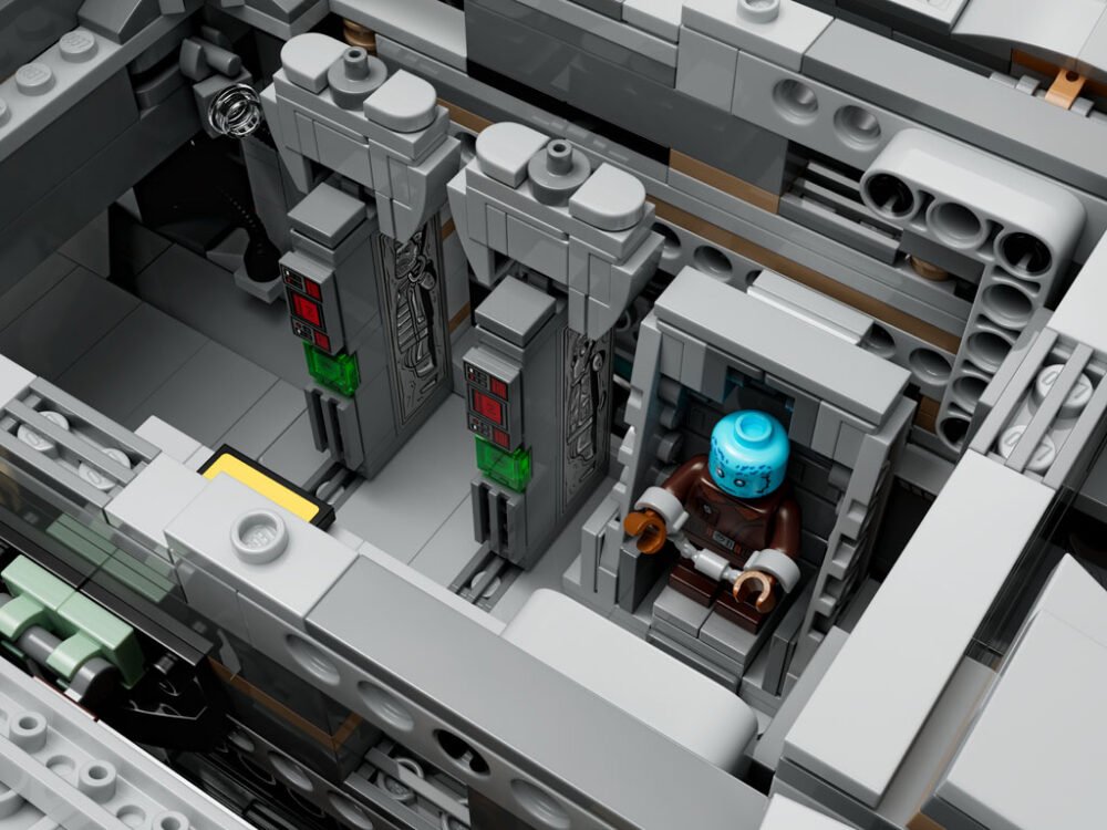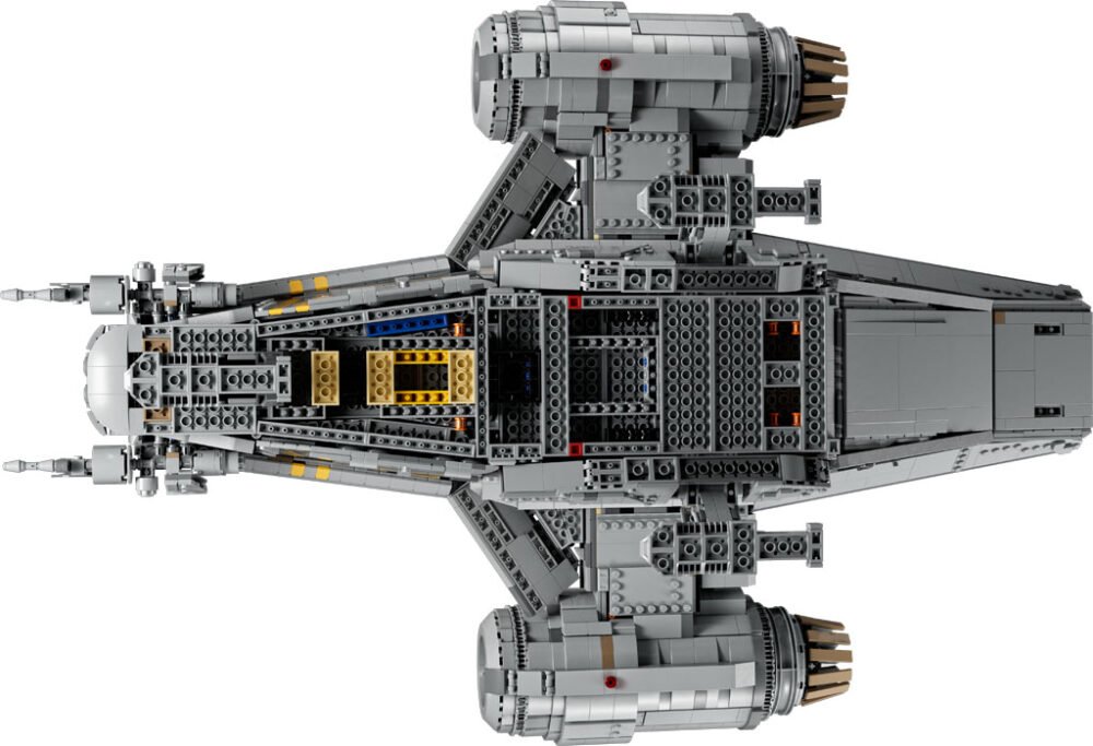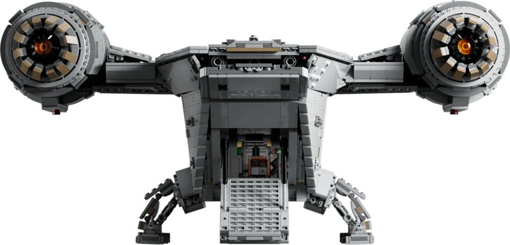 El set tiene un largo de 72cm, y los interiores de la nave tienen bastantes detalles como motores removibles, una cabina, una cápsula de escape y una cámara de congelación de carbono del tamaño de una minifigura. Además, incluye a los personajes en minifigura de Grogu, the Mandalorian, Mythrol, y Kuiil montado en un Blurrg hecho de blocks.