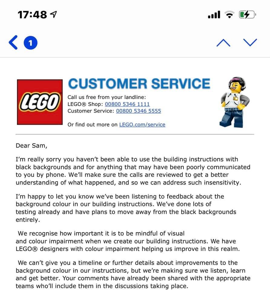 Varios fanáticos de LEGO se quejaron con Servicio a Cliente. Parece que LEGO tomó en serio las apelaciones y dejará de usar estos fondos negros en los sets. A continuación está la respuesta de LEGO a un fan, Sam Walker, que lo publicó en un grupo de Facebook. Este cambio ayudará bastante a los AFOLs a poder construir los sets sin andar mirando tanto el instructivo.