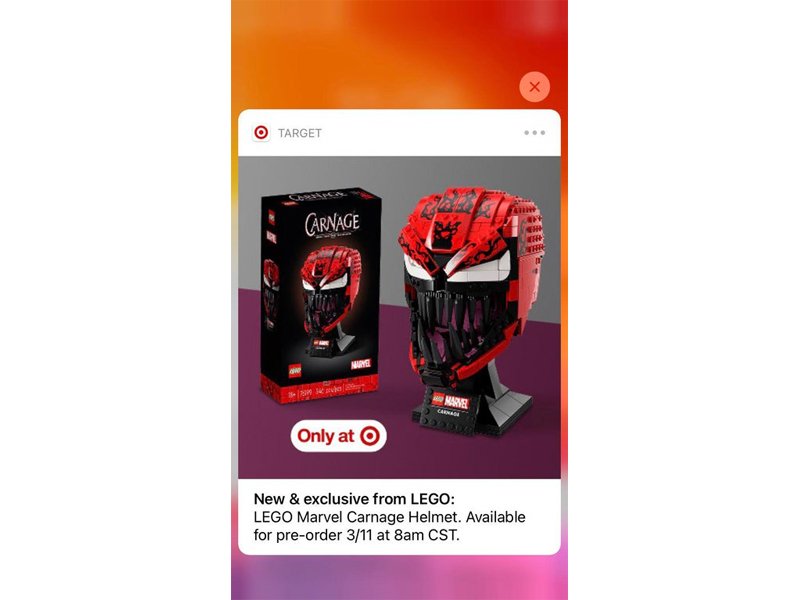 En Estados Unidos vía la aplicación de Target, se envió una notificación mostrando el nuevo juego de LEGO Marvel Casco de Carnage. Según gente en Reddit, varia gente ha recibido esta alerta en su móvil. Aún no tenemos fecha de lanzamiento oficial, pero la preventa empieza mañana, el 11 de marzo a las 8am CST para el mercado americano. Tampoco incluyeron el precio en la notificación, pero me imagino que costará igual que los cascos de LEGO Star Wars y el de Iron Man.