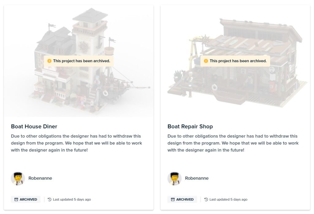 El BrickLink Designer Program ya está bastante avanzado en su etapa de pre-producción. Recientemente, se quitaron tres proyectos de este programa. Robert Bontenbal, mejor conocido como RobenAnne, tenía tres proyectos en esta fase: Boat House Diner, Boat Repair Shop, y The Dive Shop. Ahora, debido a “otras obligaciones”, tuvo que retirar los proyectos de pre-producción.