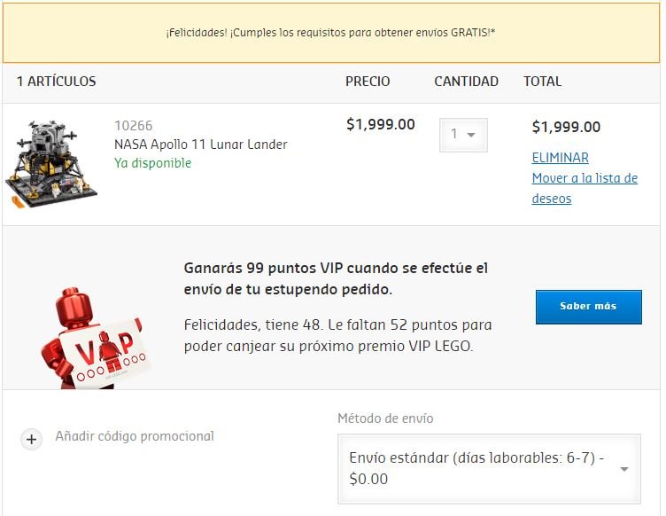 Una pista es este anuncio que aparece en Shop@Home, dónde indica que te regalan un parche con la compra del nuevo LEGO Creator NASA Apollo 11 Lunar Landar (10266). Al agregar el NASA Apollo 11 Lunar Lander a mi carrito, no me salía el parche al momento de tratar de efectuar el pago. Capaz que LEGO esta afinando los últimos detalles para por fin lanzar el programa LEGO VIP en México.
