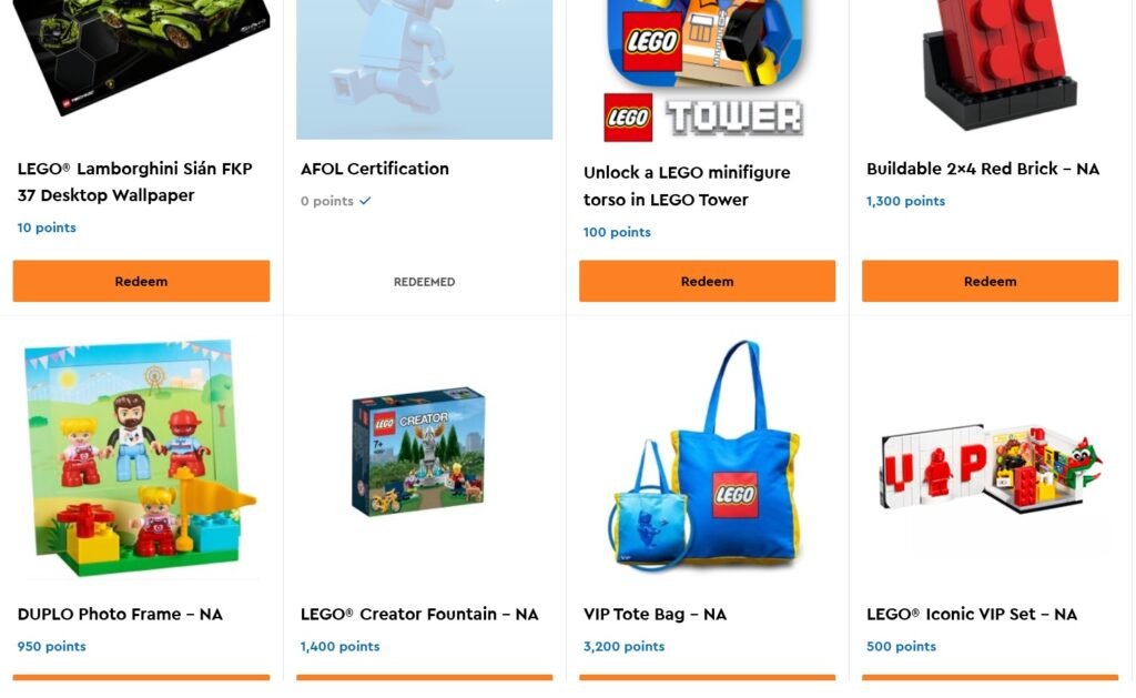 Para cada producto que quieras y canjees, recibirás un código promocional. Éste lo tendrás que usar al momento de comprar en LEGO.com. Los códigos solamente duran 60 días, así que tendrás de canjearlos bastante rápido antes de que expiren. Varios artículos cuentan con un límite de cantidades que puedes comprar con puntos. No se sabe el inventario de LEGO de estos productos promocionales.