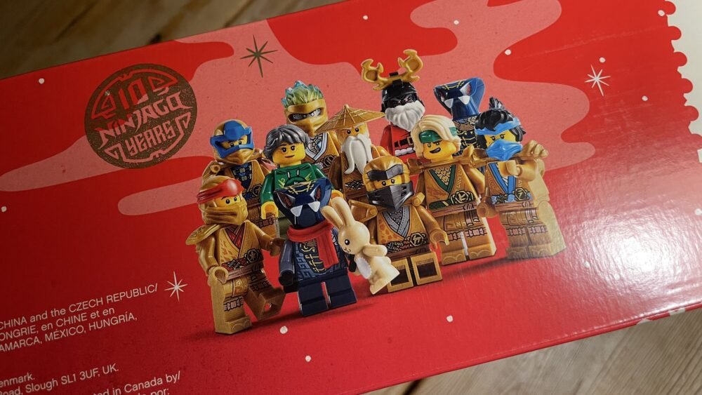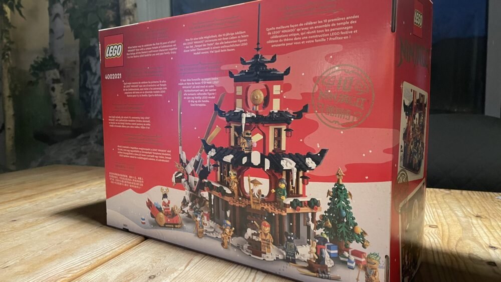 Atrás de la caja dice: “What better way to celebrate the first 10 years of LEGO Ninjago than with a unique Temple of Celebrations set that brings the themes’ well-known characters together in a fun festive LEGO build or you and your family. Enjoy.”