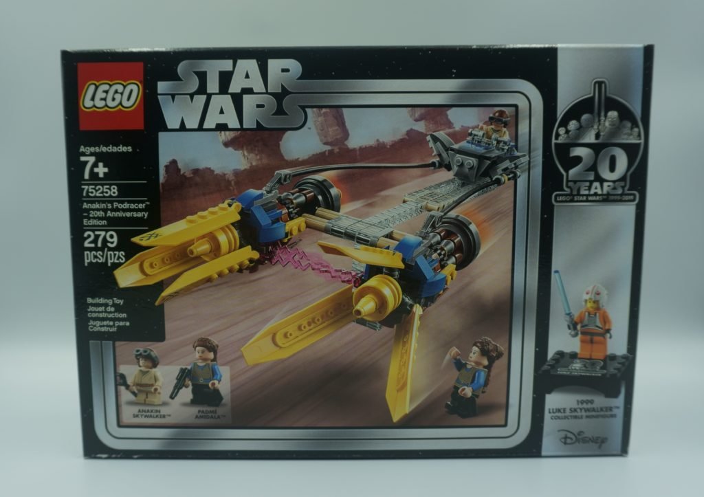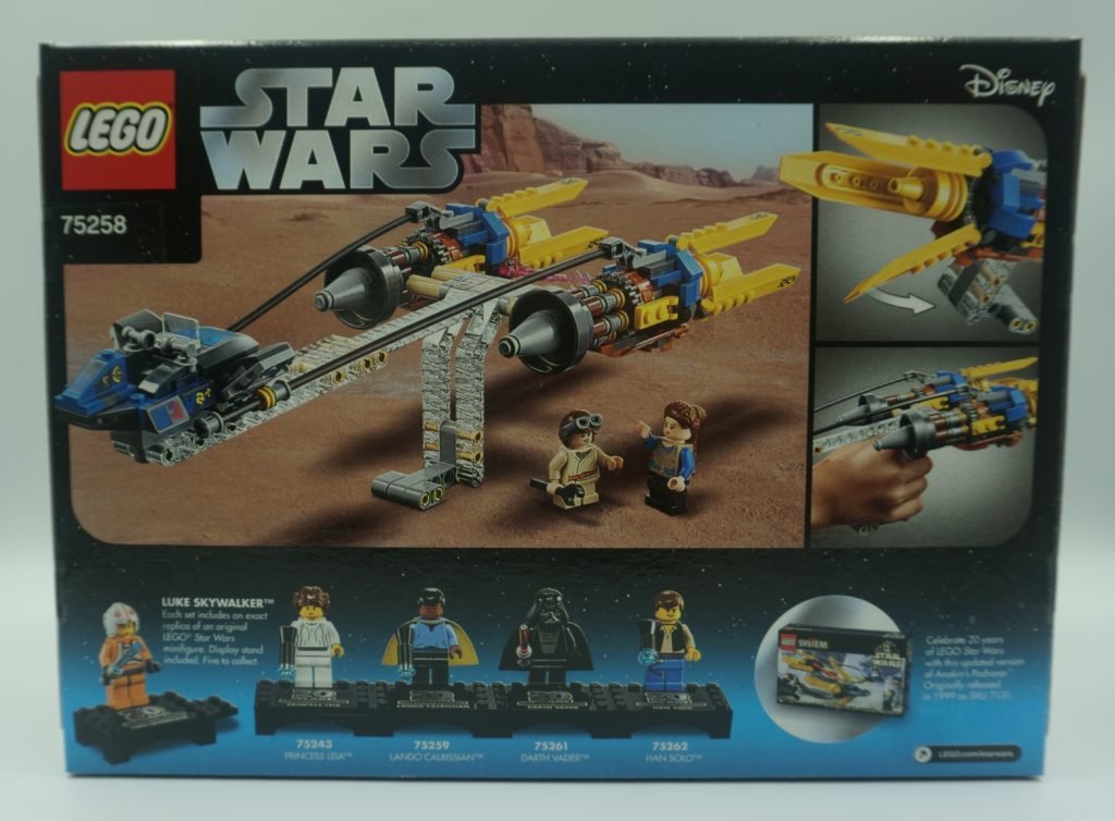 El lado de enfrente de la caja está una fotografía artística del set, con una escena parecida a la de las carreras en la película de Star Wars: Episodio I. Anakin está manejando su nave a toda velocidad mientras Padme lo saluda. Este render está enmarcado con negro y dos rayas plateadas y a su lado derecho hay una línea vertical más gruesa con el logotipo de celebración de los 20 años de LEGO Star Wars. También se muestra la minifigura exclusiva de Luke Skywalker de 1999, con su traje de piloto.
