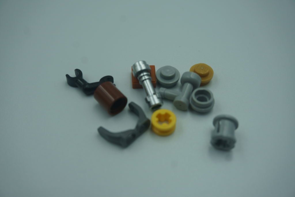 Al final de la construcción, me sobraron bastantes piezas. Me sobraron 2 conectores de cruz (uno ancho gris, uno amarillo delgado), 3 piezas redondas 1×1 (dos grises, una dorada), un visor de casco para minifiguras, una placa 1×1 marrón, un conector redondo ancho café, un brazo de robot, una manija gris y una base de la lightsaber de Luke Skywalker plateada.
