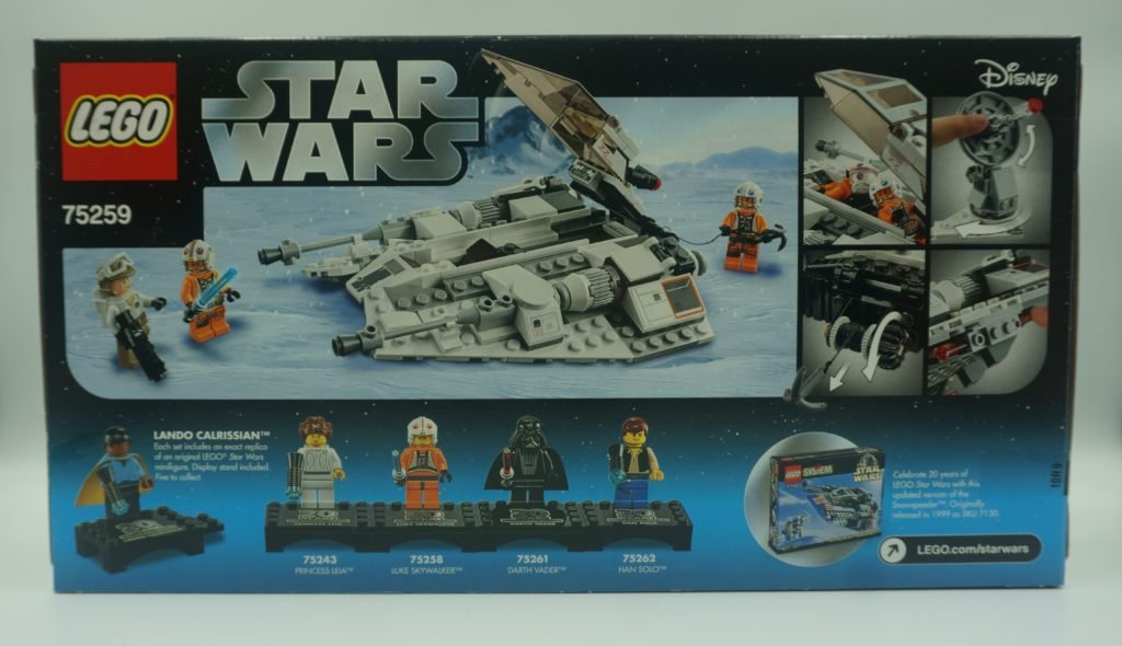 Por el reverso hay cinco imágenes que te demuestran todas las características de juego que tiene el set, como disparar desde el torrente o desenrollar el gancho para cazar a un AT-AT. Debajo de las imágenes informativas, encuentras una breve descripción de la minifigura exclusiva de Lando Calrissian, acompañado de las otras 4 minifiguras exclusivas que puedes encontrar en los diferentes sets del 20 aniversario de LEGO Star Wars. Por último, en la esquina de abajo en la derecha, está una imagen de la caja de la Speeder de nieve original que salió en 1999.