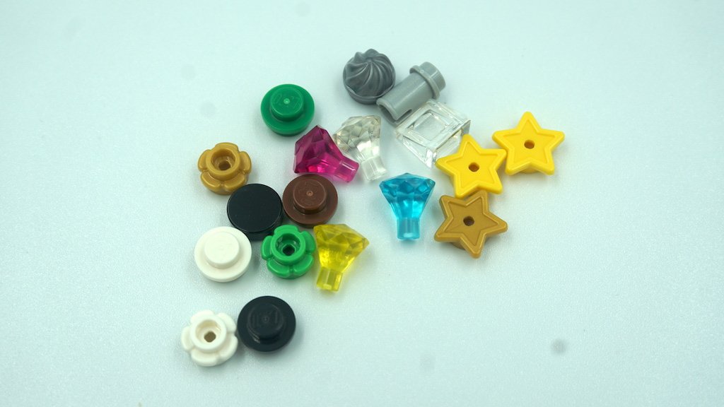 Me sobraron bastantes piezas, muchas de las cuales fueron repetidas de las decoraciones. Aquí claramente se ven los diamantes de diferentes colores, al igual que las piezas redondas 1×1 y de flor, que se usaron varias veces para decorar el árbol de Navidad. También, me sobraron bastantes estrellas que hasta me hicieron dudar si me faltó colocar alguna mientras construía el juego de LEGO navideño.