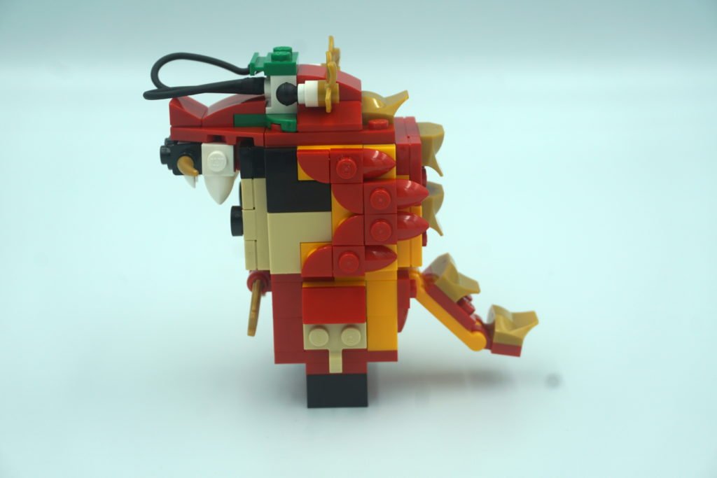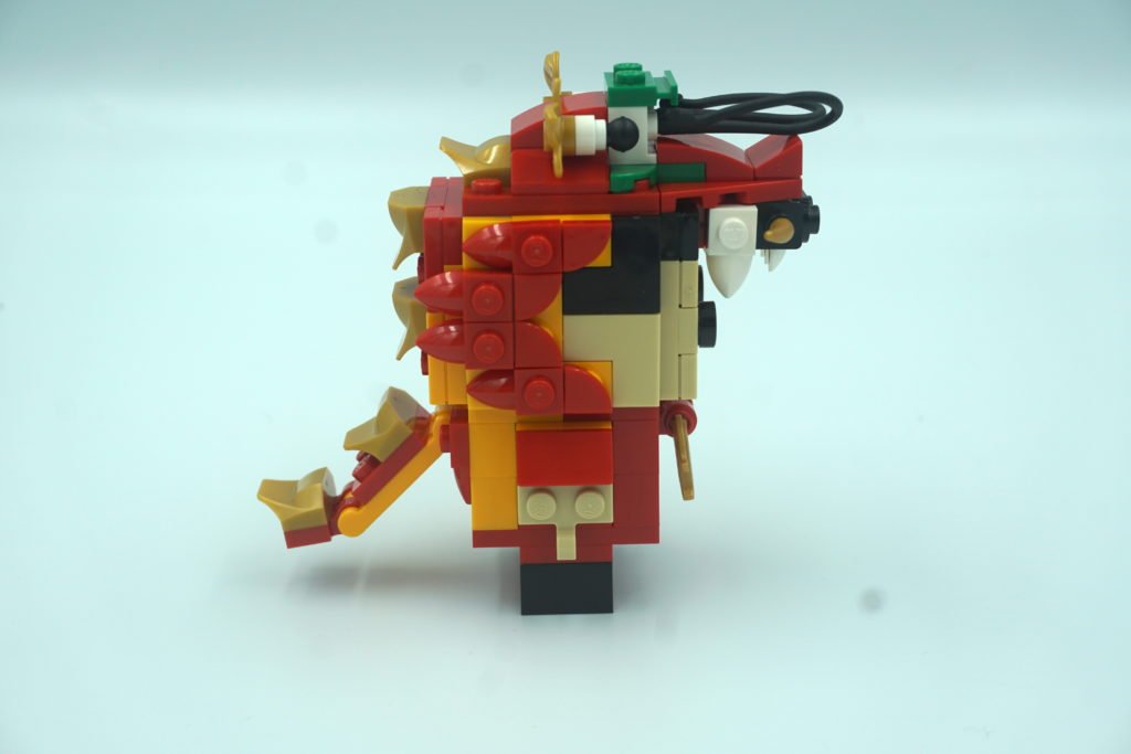 Me gustó mucho la construcción de este BrickHeadz aunque la decoración de la base estuvo bastante sencilla. Los detalles diseñados para el disfraz del bailarín me gustaron bastante. La cola con escalas doradas, la cabeza de dragón con dientes filosos, y el torso decorado con una mezcla de rojo, amarillo, dorado y marrón, hacen de esta construcción muy placentera para exhibir junto tu colección.