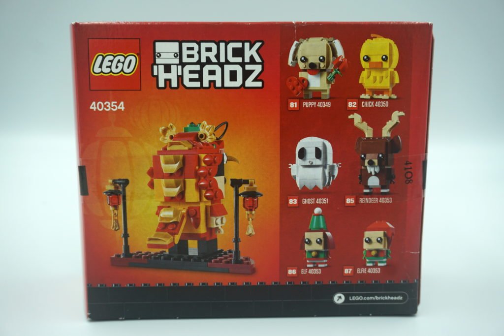 En el reverso del lado izquierdo, viene una fotografía del bailarín de espaldas para mostrar los detalles de su disfraz y de su cola de dragón. En esta foto si está el BrickHeadz posando en su base negra. Al lado derecho están los otros sets de temporada del tema BrickHeadz, incluyendo el Cachorro, el Pollito, el Fantasma, y el Reno y los Duendes.