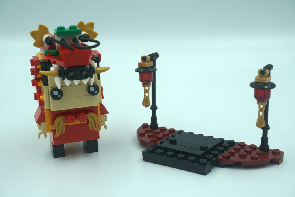 Me gustó mucho la construcción de este BrickHeadz aunque la decoración de la base estuvo bastante sencilla. Los detalles diseñados para el disfraz del bailarín me gustaron bastante. La cola con escalas doradas, la cabeza de dragón con dientes filosos, y el torso decorado con una mezcla de rojo, amarillo, dorado y marrón, hacen de esta construcción muy placentera para exhibir junto tu colección.