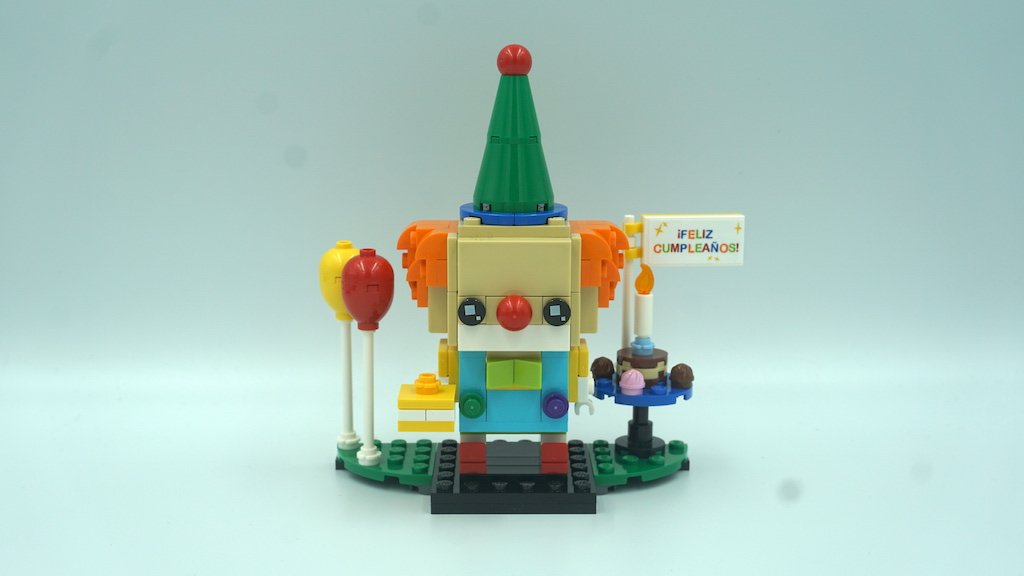 Me gustaron mucho los colores que se usaron para construir a este BrickHeadz. Es claro que el que resalta aquí es el payaso, ya que usa colores más llamativos que los de sus decoraciones en la base. También se me hizo buen detalle el que esté sosteniendo un regalo en su mano derecha, listo para celebrar.