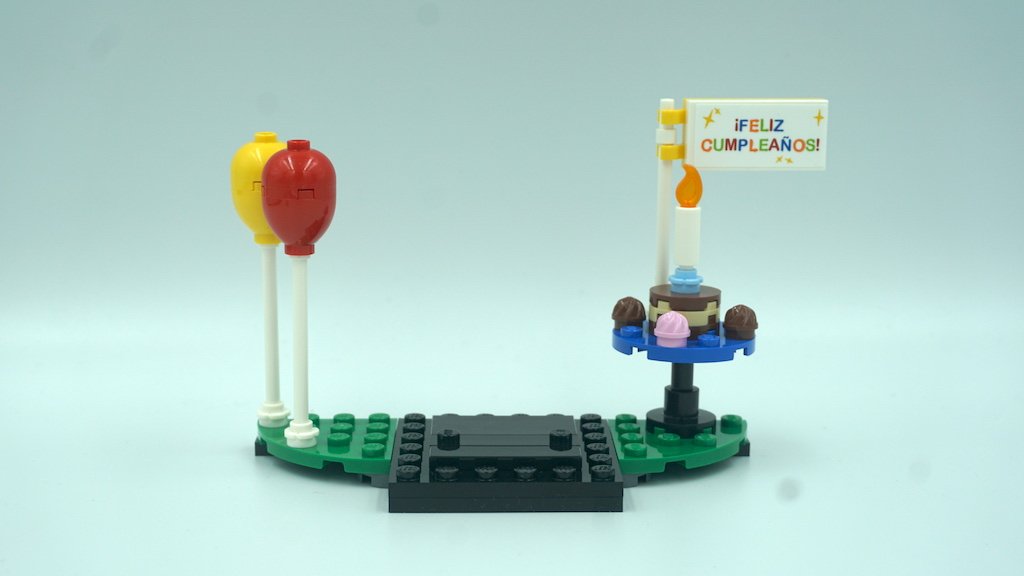 Para la segunda parte de la construcción, la base extendida se me hizo algo sencilla pero igual colorida. Del lado izquierdo son unos globos, muy fáciles de construir. Del lado derecho está el pastel con su mesita, vela y un letrero de ¡Feliz Cumpleaños! No fue lo más complicado del mundo construir esta base extendida, pero tiene detalles buenísimos como la vela y el letrero.