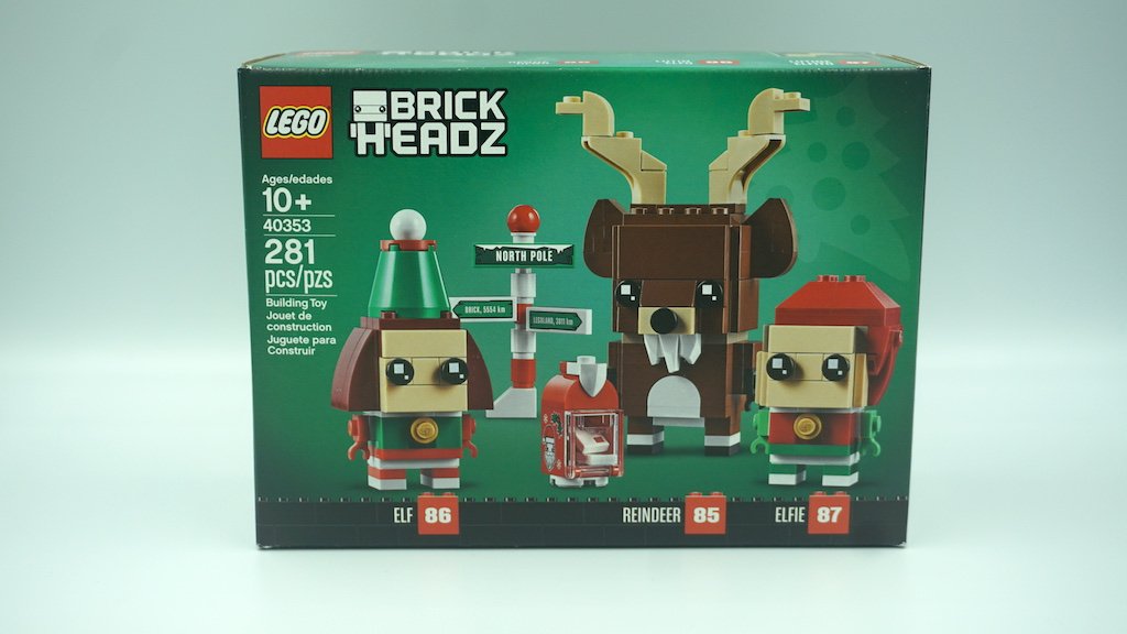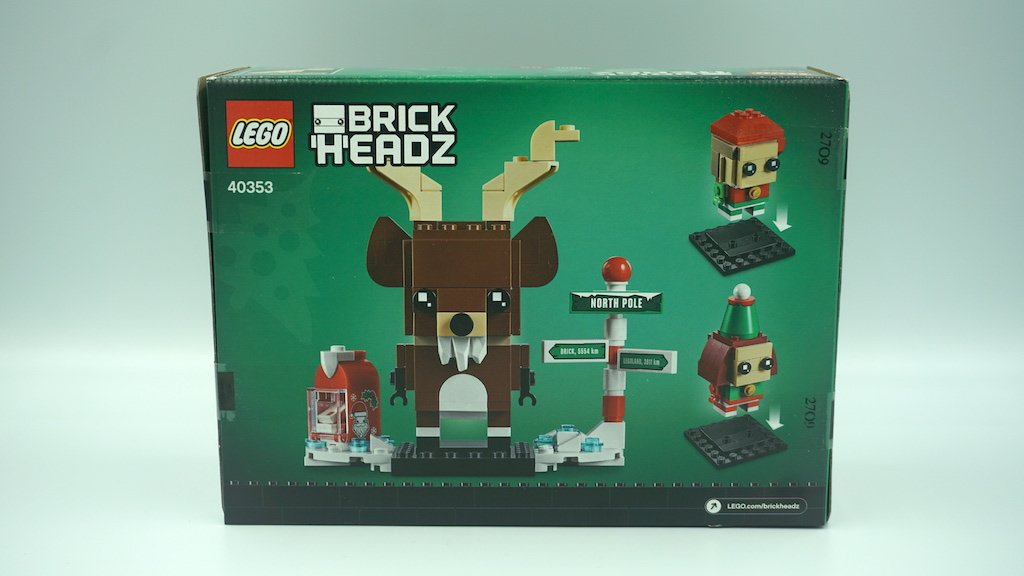 Parecida a todos los demás LEGO BrickHeadz de temporada, en la esquina derecha de arriba de la caja hay una filigrana, en este caso, un pino de Navidad. El fondo de la caja es de tonos verdes y a través de todo el lado inferior, dentro de blocks rojos, están numerados los personajes 86 Elf, 85 Reindeer y 87 Elfie. Los tres personajes salen posando sin su base negra, y los letreros y el buzón están por separado sin sus bases blancas. Del lado izquierdo se encuentran todos los detalles del set: edad sugerida, número de serie, cantidad de piezas y descripción del juguete.