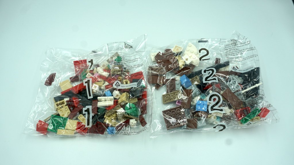 LEGO te divide la construcción de los 3 personajes y su escenario en dos bolsas numeradas. Tener bolsas numeradas es normal en construcciones de LEGO BrickHeadz con más de un personaje. La bolsa número 1 es para los Duendes, mientras que la 2 es para el Reno y el escenario. La construcción de los Duendes está dividida en 23 pasos para el duende hombre y 22 pasos para la duende mujer. El Reno con su escenario está dividido en 52 pasos.