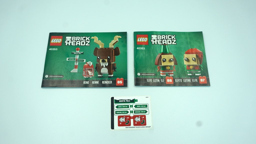 Así como cada set de LEGO BrickHeadz con dos personajes, este juego cuenta con dos libros de instrucciones. El primero es la construcción del Reno mientras que el segundo es la construcción de ambos Duendes. Lo que se me hizo raro fue que junto a los instructivos, también vino un set de calcomanías, cuando normalmente los BrickHeadz tienen puras piezas impresas. Ambos instructivos cuentan con 47 páginas, teniendo un total de 94 páginas de las cuales 92 son de construcción.