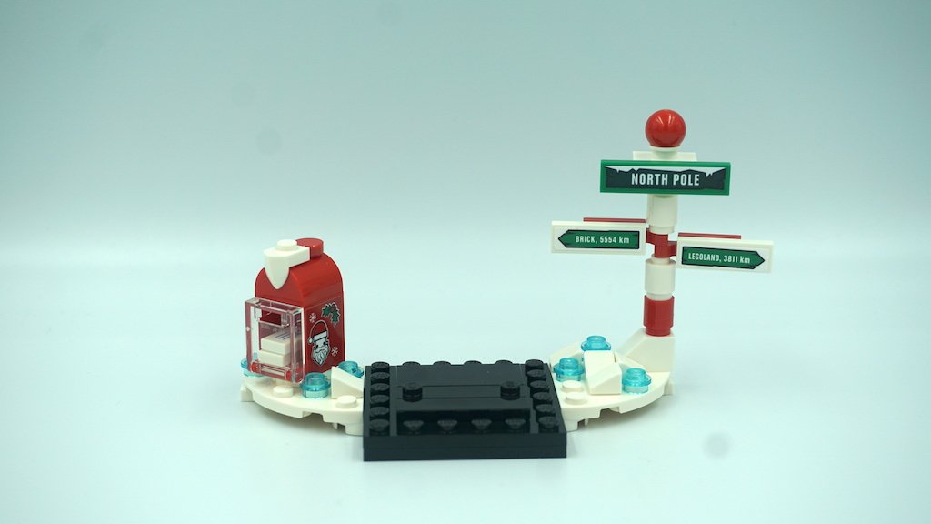 Ya que este es un LEGO BrickHeadz de temporada y celebra la Navidad, la última parte de la construcción trata de la base extendida con decoraciones laterales. Del lado izquierdo, se aprecia un buzón donde llegan todas las cartas a Santa. Del lado derecho, están los letreros de dirección que avisa que estás en el Polo Norte. Para esta parte, se usan las calcomanías, y creo que fue porque a LEGO se le complicó hacer la pieza del buzón impresa, y por ende se le hizo más barato hacer calcomanías para los letreros también. No soy fan de las calcomanías, pero entiendo por qué pudo haber pasado esto por primera vez en un juego de LEGO BrickHeadz.