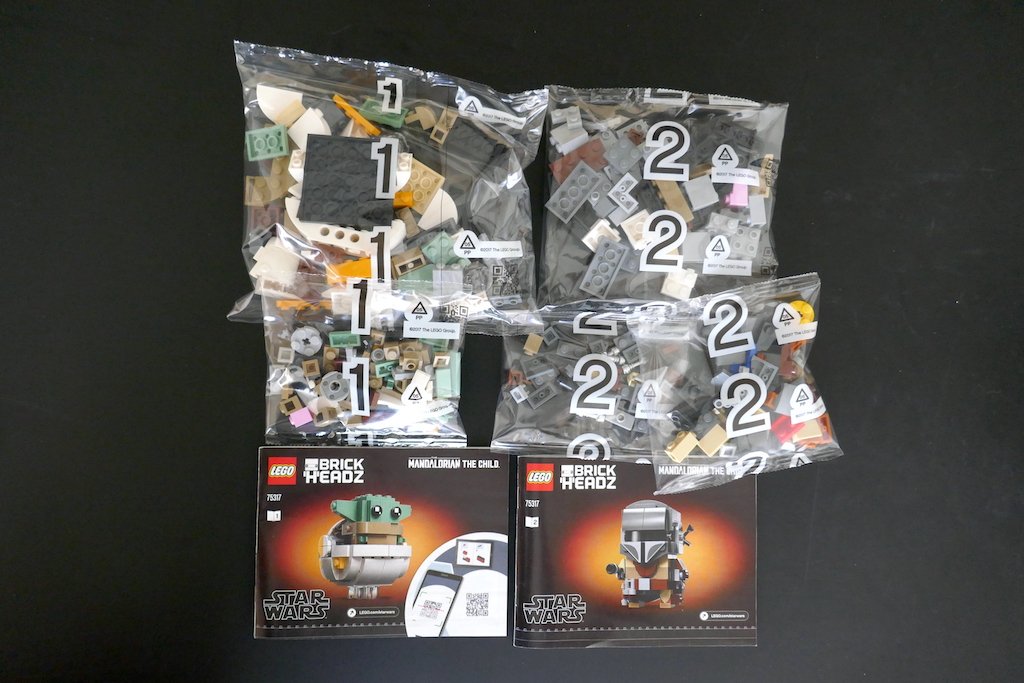 Dentro de la caja tendrás dos bolsas con el número 1 y tres bolsas con el número 2. Asimismo, hay dos libros de instrucciones, el 1 que construye a Baby Yoda, y el 2 que construye al Mandaloriano. Como pueden suponer, las bolsas con el 1 corresponden a la construcción del instructivo 1 y las bolsas con el 2 al instructivo 2.