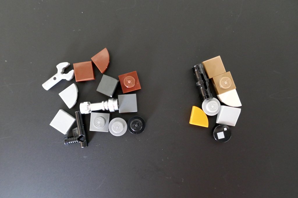 Me sobraron bastantes piezas en esta construcción. No muy interesantes en realidad. Esperaría que hubiera una que otra color verde Yoda, pero la construcción de Baby Yoda no tuvo piezas chicas. De la foto de abajo, las piezas de la izquierda son del Mandaloriano mientras que las de la derecha de Baby Yoda.