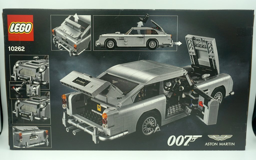 En el reverso, el fondo es aún más simple: todo negro con un humo rodeando el coche. Los logotipos de 007 y Aston Martin vuelven a aparecer en la esquina posterior derecha. El DB5 se encuentra con todos sus compartimentos abiertos, dándole la espalda a nosotros. En los alrededores hay recuadros ilustrando todos los detalles y piezas movibles del coche, muchos de los cuales son inspirados de las películas del super espía más famoso del mundo.