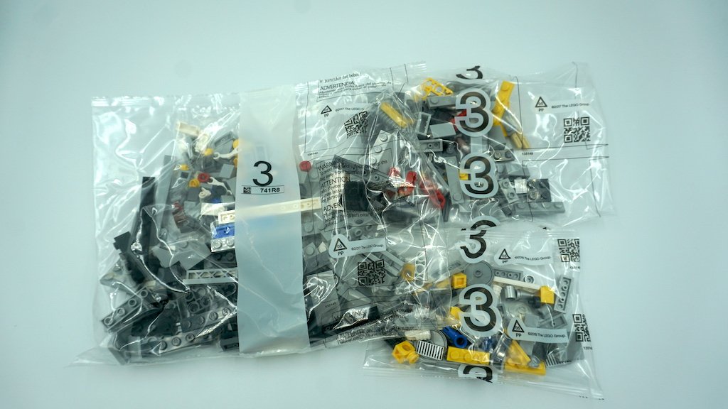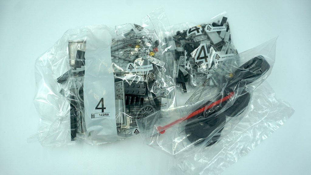 Al abrir la caja, hay bastantes bolsas, el instructivo de construcción, y un set de calcomanías. LEGO te divide la construcción en cuatro pasos a grandes rasgos. Existen tres bolsas con el número 1, 2, y 3, así como dos bolsas con el número 4 y una bolsa no numerada. Los sets de bolsas del 1 al 3 cuentan con una bolsa grande, una mediana, y una última más pequeña, mientras que las numeradas con el 4 es una grande y una mediana. Por último, la bolsa que no está numerada contiene las llantas y el eje (pieza larga y roja) principal del carro.