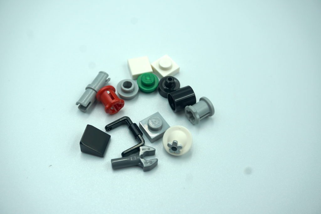 Sorprendentemente, me sobraron pocas piezas al final de la construcción. Me sobraron 2 conectores de cruz (uno gris, uno rojo), 3 piezas redondas 1×1 (una grises, una verde y una negra), una herramienta gris obscura, un conector redondo negro, una placa 1×1 blanca, una placa triangular negra, dos piezas cuadradas 1×1 (una blanca y una gris), el complemento de la cubeta en negro, y un sombrero de Minnie extra.