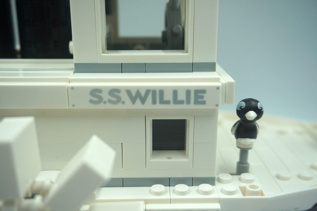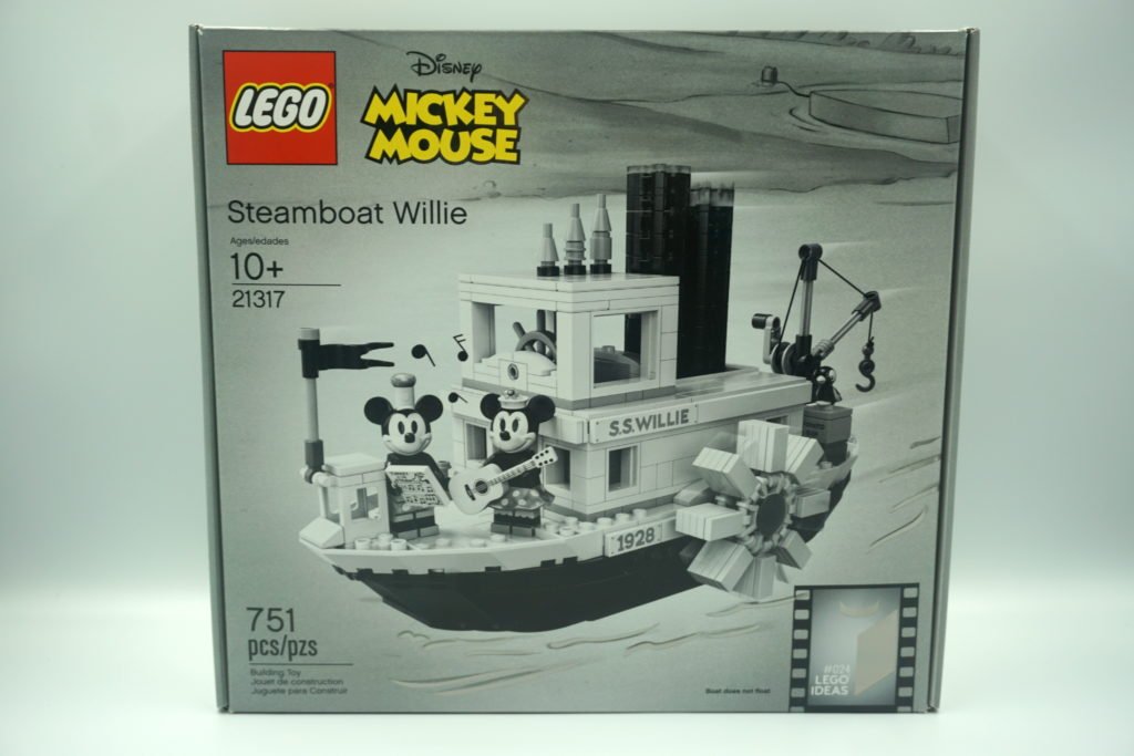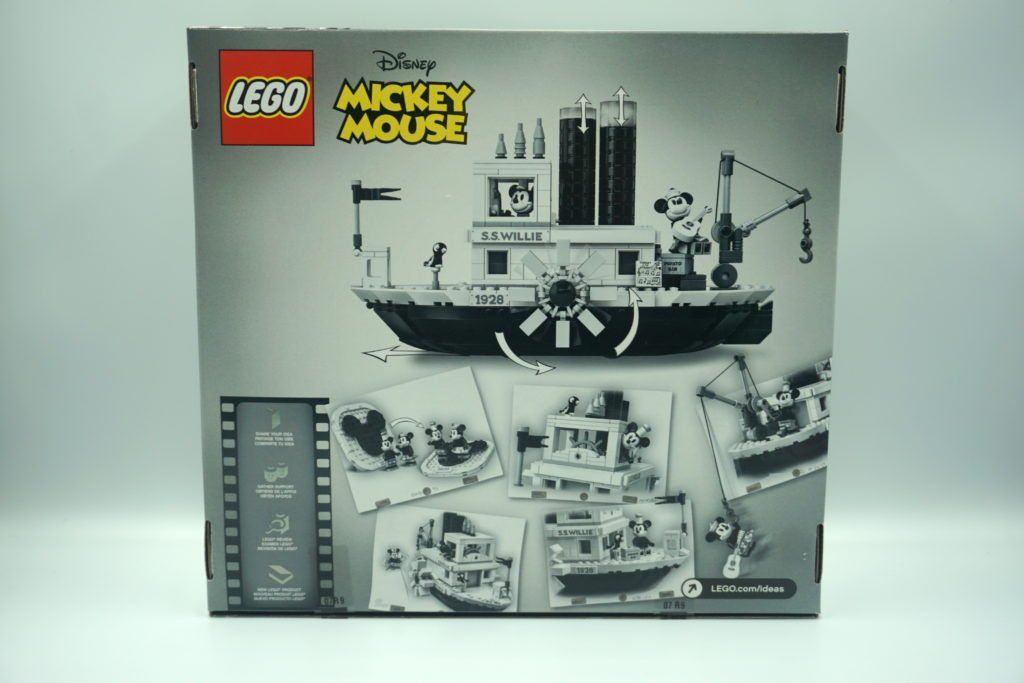 En el frente de la caja hay una fotografía artística del set, todo en blanco y negro con el Botero Willie navegando por un rio. El detalle interesante es que en la esquina derecha de abajo, se puede observar el logo de LEGO Ideas en plateado. Se me hizo interesante porque LEGO usó este mismo color brillante para varias partes del barco al igual que en las minifiguras de Mickey y Minnie.