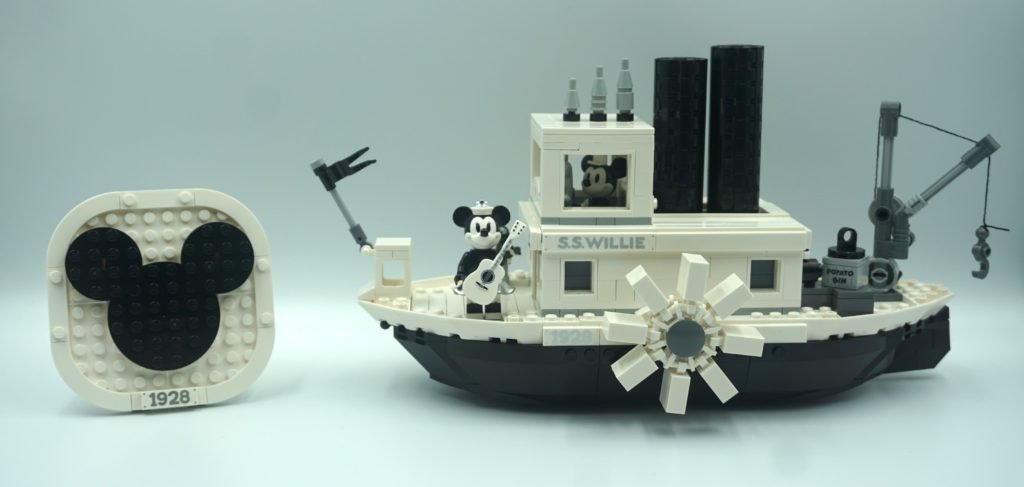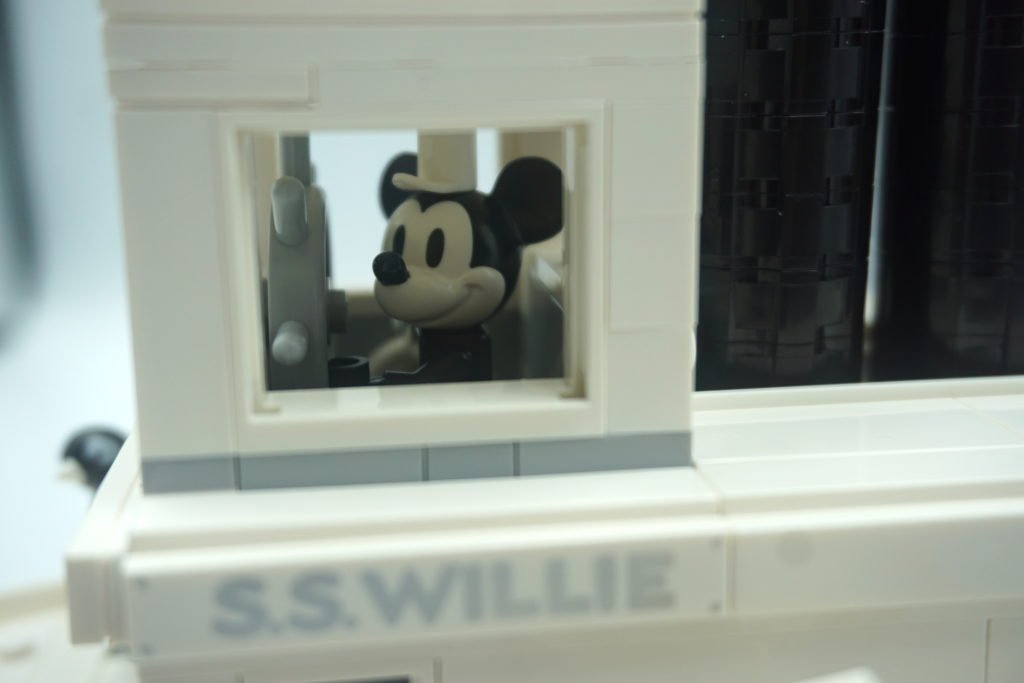 El set estaba dividido en 3 bolsas numeradas y dos piezas grandes del bote. Me sorprendió que me tardara tanto tiempo en armarlo ya que solo tiene 751 piezas. Me imaginaría que acabaría de armarlo en una hora, pero me tardé alrededor de hora y media. La construcción empieza muy simple, construyendo el exhibidor con el icónico símbolo de Micky Mouse y una placa con el 1928 para celebrar los 90 años del ratón más famosos de la historia. Rápidamente se empieza a complicar al empezar a hacer las entrañas del bote.