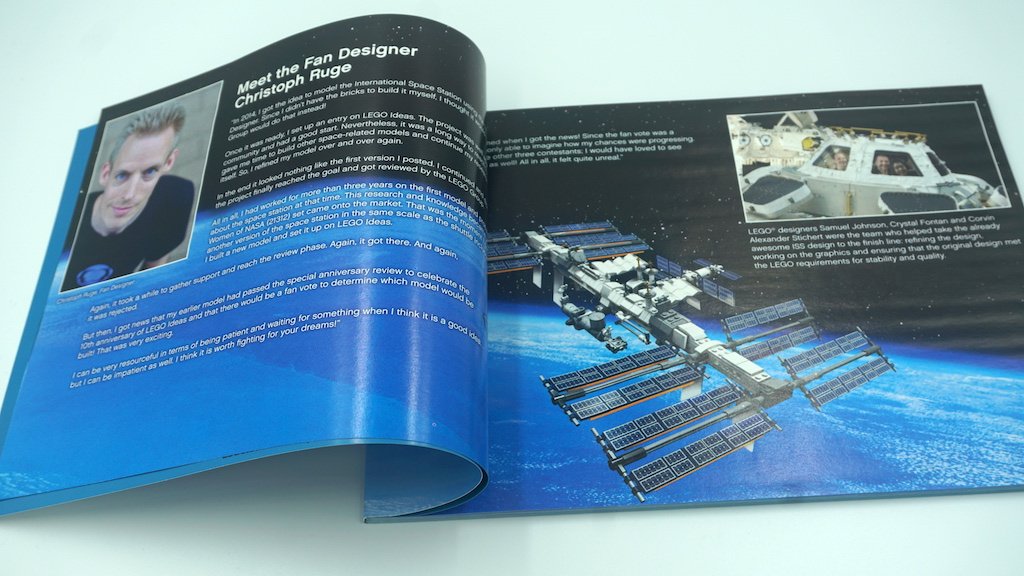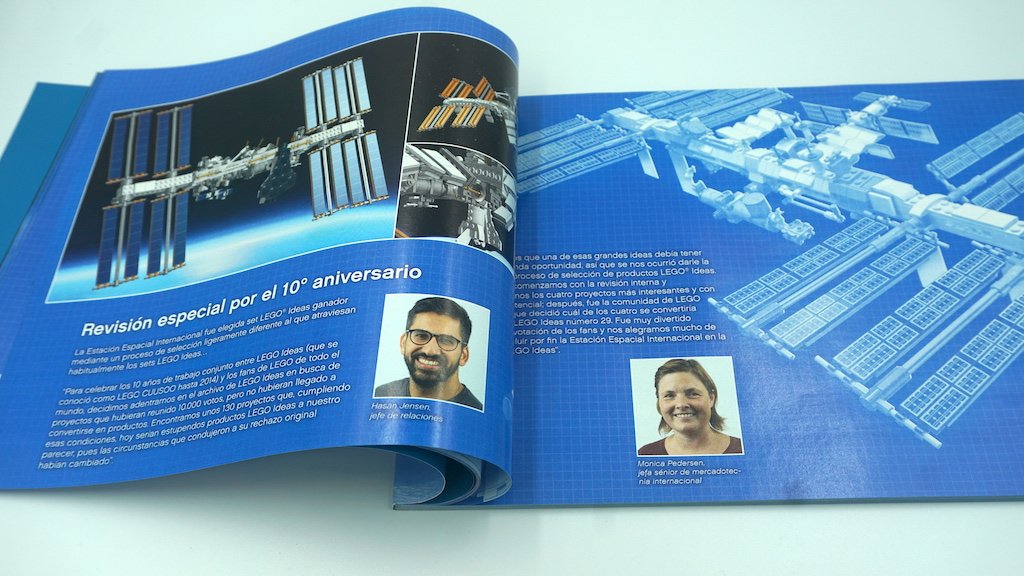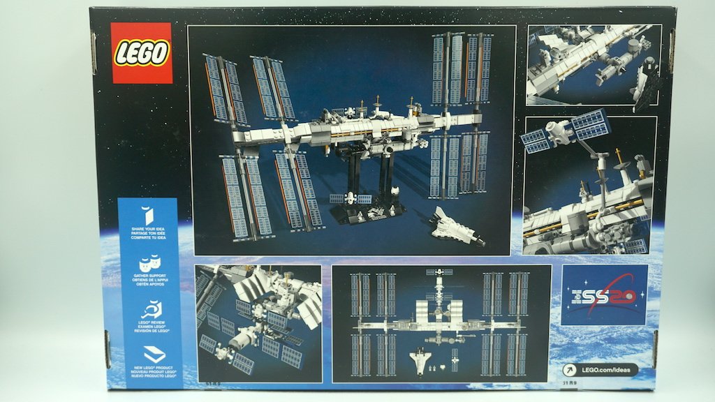 En el reverso, vienen varias fotos artísticas del set. Todas llevan un fondo azul marino en el centro que se va oscureciendo en las orillas. La esquina de abajo del lado derecho viene el logotipo celebrativo del ISS20 (por sus siglas en inglés), conmemorando los 20 años que lleva el EEI orbitando nuestro planeta. Del lado izquierdo, LEGO te plasma los cuatro pasos que puedes tomar para que tus diseños también se vuelvan sets oficiales de LEGO Ideas.