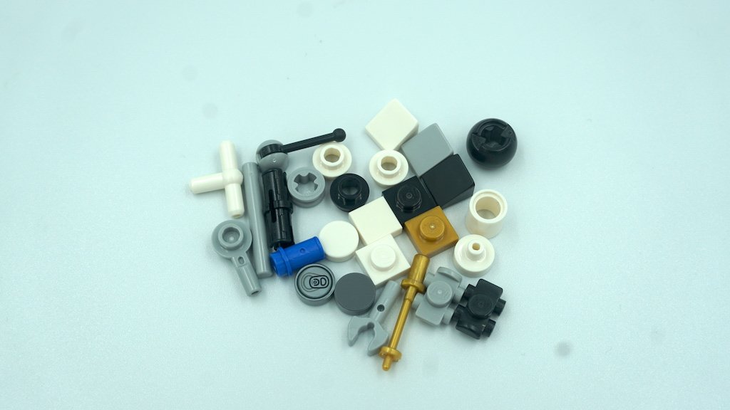 Me sobraron bastantes piezas al final de la construcción de este set. Muchas de ellas no son tan especiales ni exclusivas, pero hubo un par que si me llamaron la atención. Éstas son la varita dorada que se usó para los satélites y la placa redonda 1×1 con la impresión de una lata. Ambas piezas son un poco más raras y difíciles de encontrar. En total me sobraron 27 piezas, todas distintas menos un par de piezas redondas 1×1 blancas.