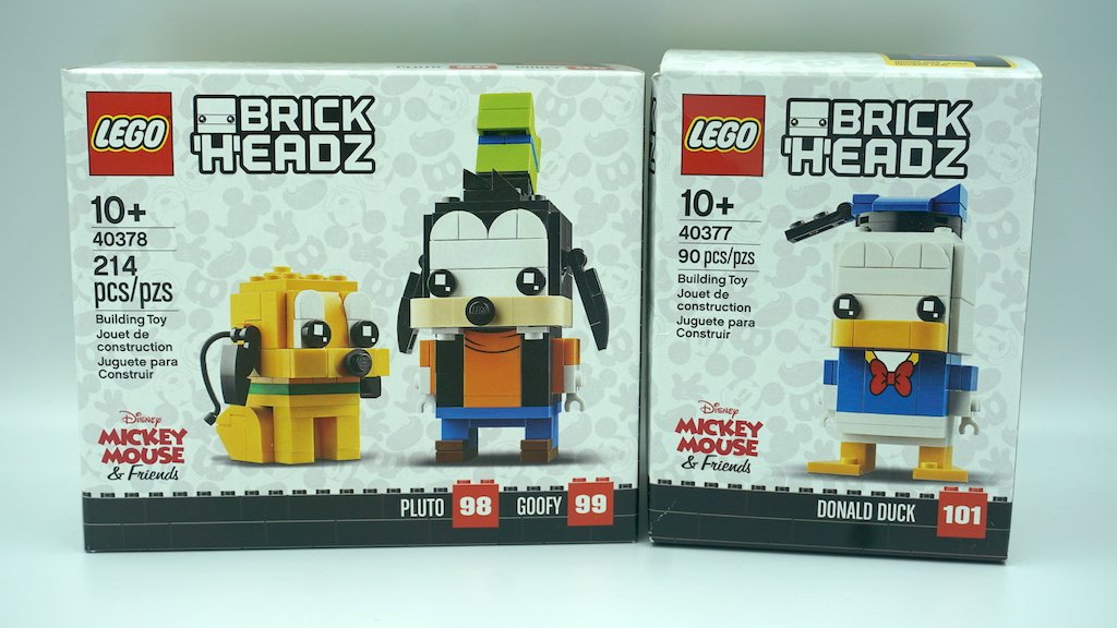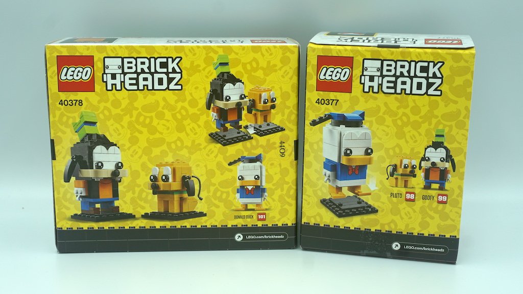 Para el frente de las cajas, LEGO optó por un fondo blanco y un patrón gris con figuras de Mickey Mouse. En ambas esquinas posteriores izquierdas, viene el logotipo de Disney Mickey Mouse & Friends. La caja de Goofy y Pluto (40378) es más alargada dado que tiene dos personajes. La cada del Pato Donald (40377) es igual a todas las cajas de BrickHeadz de personajes individuales. Pluto es catalogado como el BrickHeadz número 98, Goofy como el 99 y el Pato Donald da el salto hasta el 101.