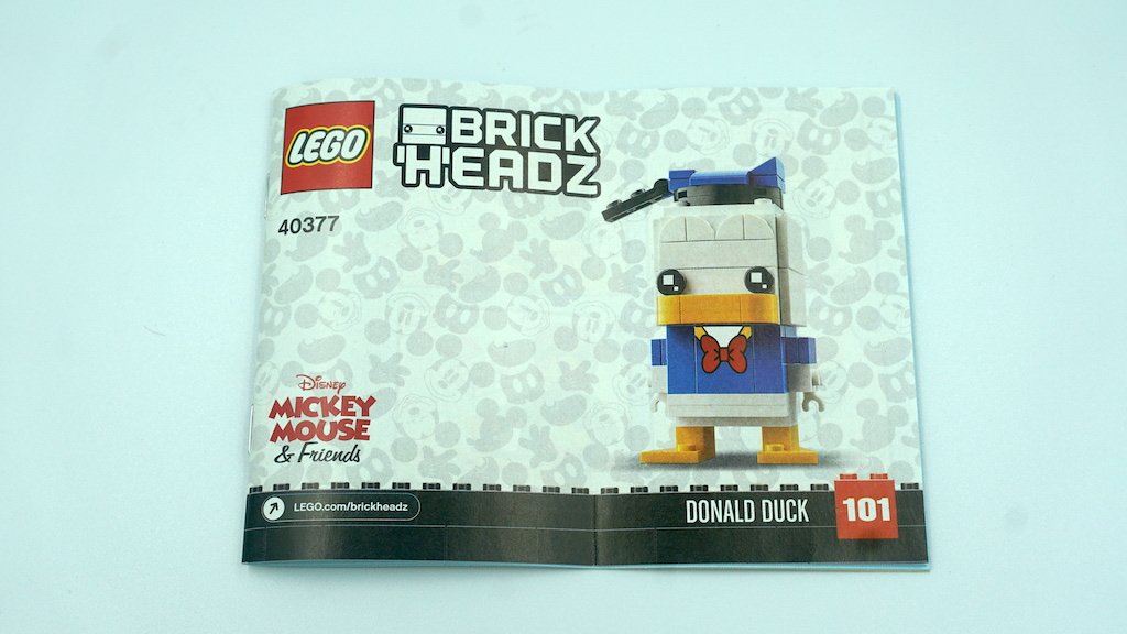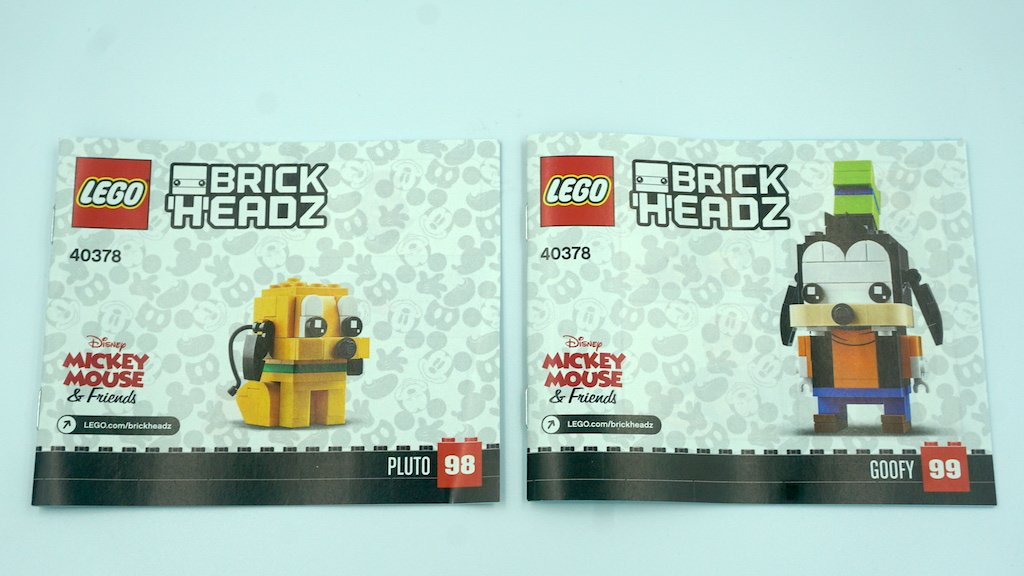 Los instructivos de estos BrickHeadz son bastante cortos. El combo de Goofy y Pluto tienen un libro de instrucciones para cada personaje, con 43 páginas y 31 páginas respectivamente. El instructivo del Pato Donald está en un tamaño intermedio de ambos anteriores, con 35 páginas. Todos los instructivos cuentan con el mismo fondo del frente de la caja y su block rojo que indica el número de BrickHeadz.
