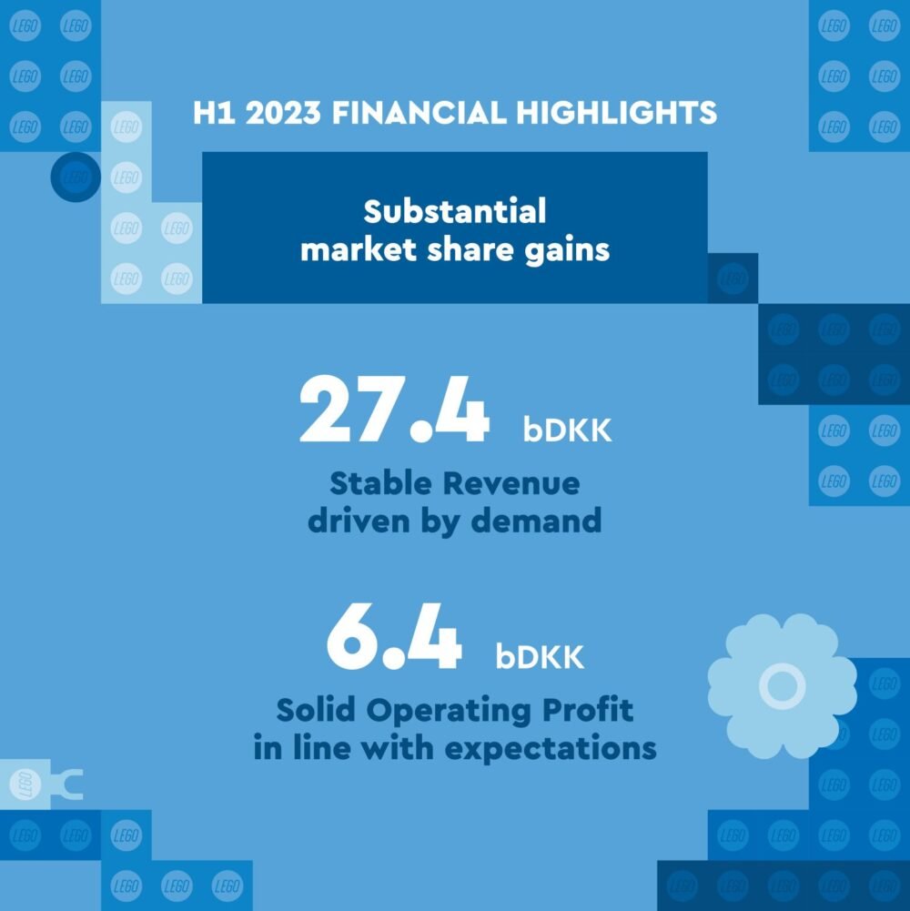 LEGO ha anunciado sus resultados del primer semestre del 2023 y ha superado a la industria juguetera ya que ésta reportó que de redujo en estos primeros 6 meses del año. Las ventas crecieron 3% en comparación con el mismo período del año pasado gracias a la demanda de una cartera relevante y diversa. Los ingresos ascendieron a 27.4 mil millones de coronas danesas, 1 % más alto que el año pasado. LEGO Icons, LEGO Star Wars, LEGO Technic y LEGO City fueron los temas más destacados.